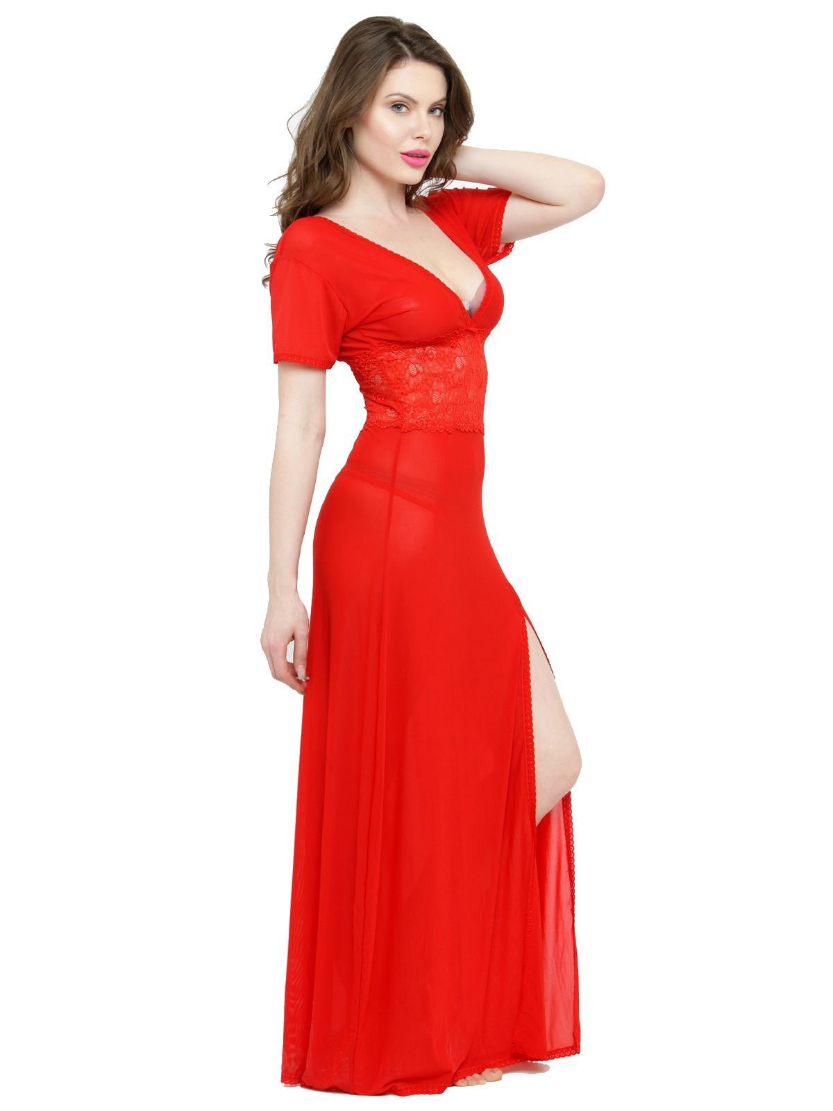 N-Gal Women's V-Neck Splicing Lace Nighty Night Dress Nightwear with G-String_Red