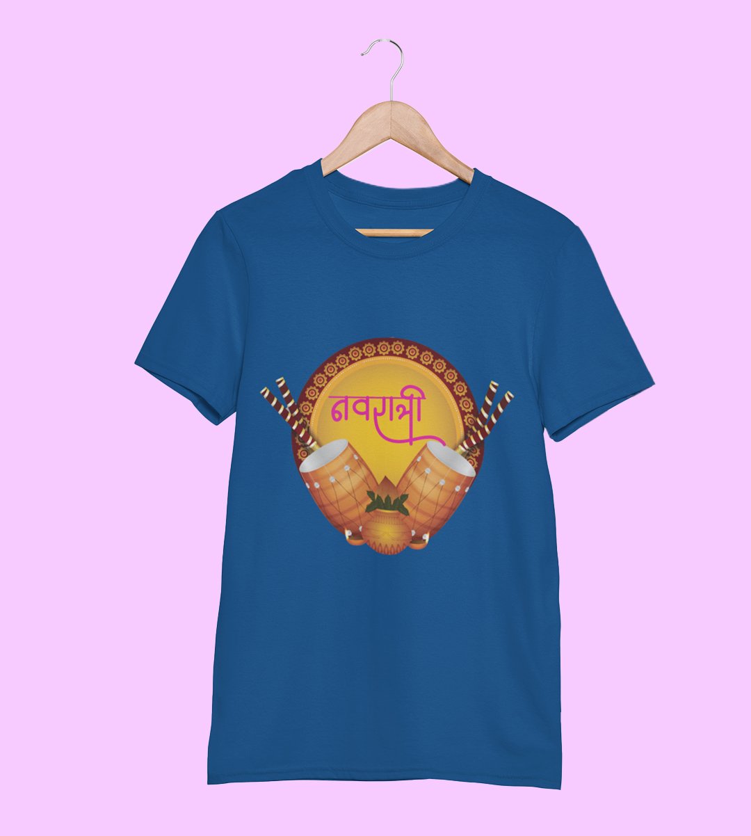Navratri (2 dhaks) printed unisex adults round neck cotton half-sleeve blue tshirt specially for Navratri festival/ Durga puja