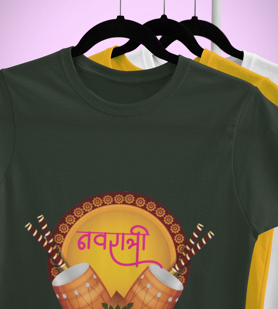 Navratri is a very auspicious festival for hindus. It takes place at the beginning of October and sometimes September. Enjoy the 9 days of festivities with full zeal and make yourself submerged in the love of Maa Durga. Navratri is also known as Durga Puja. And with this Tees, you can shine like a star during this festive season with our navratri themed cotton half sleeved Tshirts. You can pair our t-shirts with trousers and denim of your choice and make it a weekday smart casual or weekend wear. This is durable. This tshirt is smooth and soft which makes you comfortable to wear during all seasons. The printing in it is durable and odourless. It has five sizes, S,M,L,XL,XXL. The Tshirt colour is intact even after repeated washes. It can be kept in your wardrobe and hangers. Please avoid washing mashine to clean this Tee, it may affect the print. Hand wash only. We have brought you many navratri related designs printed on our different colour Tshirts to choose from. Grab it now.