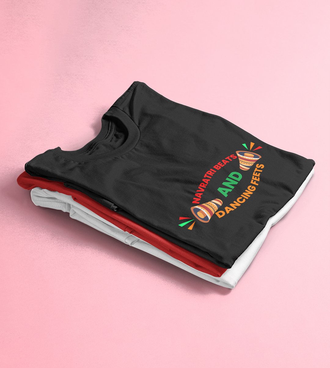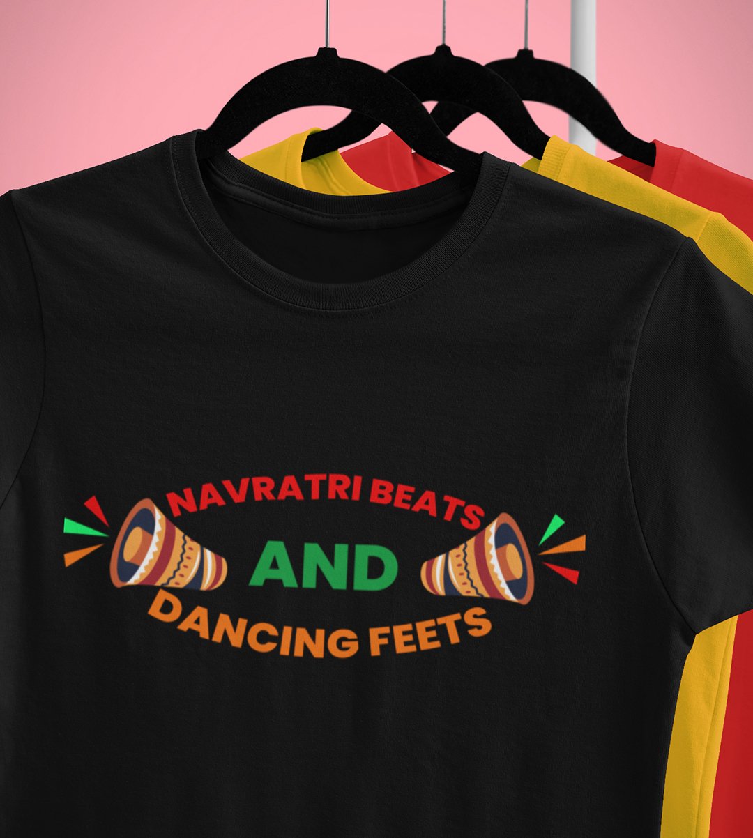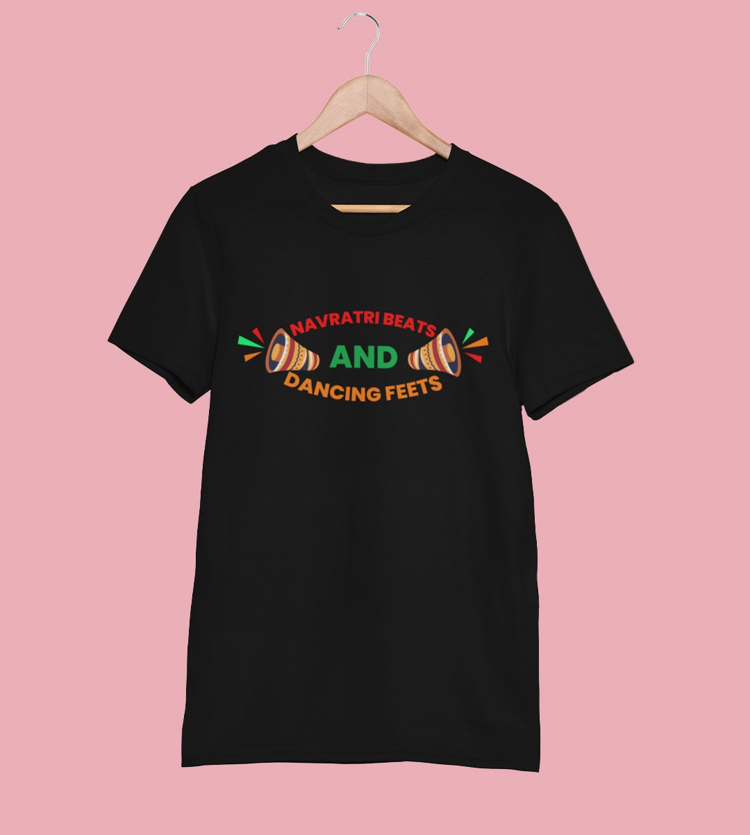 Navratri beats and dancing feets printed unisex adults round neck cotton half-sleeve black tshirt specially for Navratri festival/ Durga puja