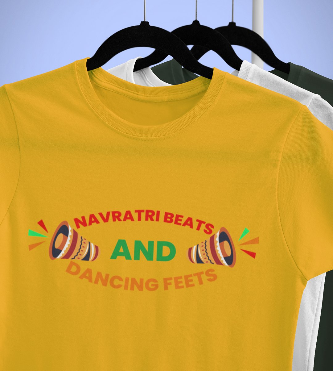 Navrtri beats printed unisex adults round neck cotton half-sleeve yellow tshirt specially for Navratri festival/ Durga puja