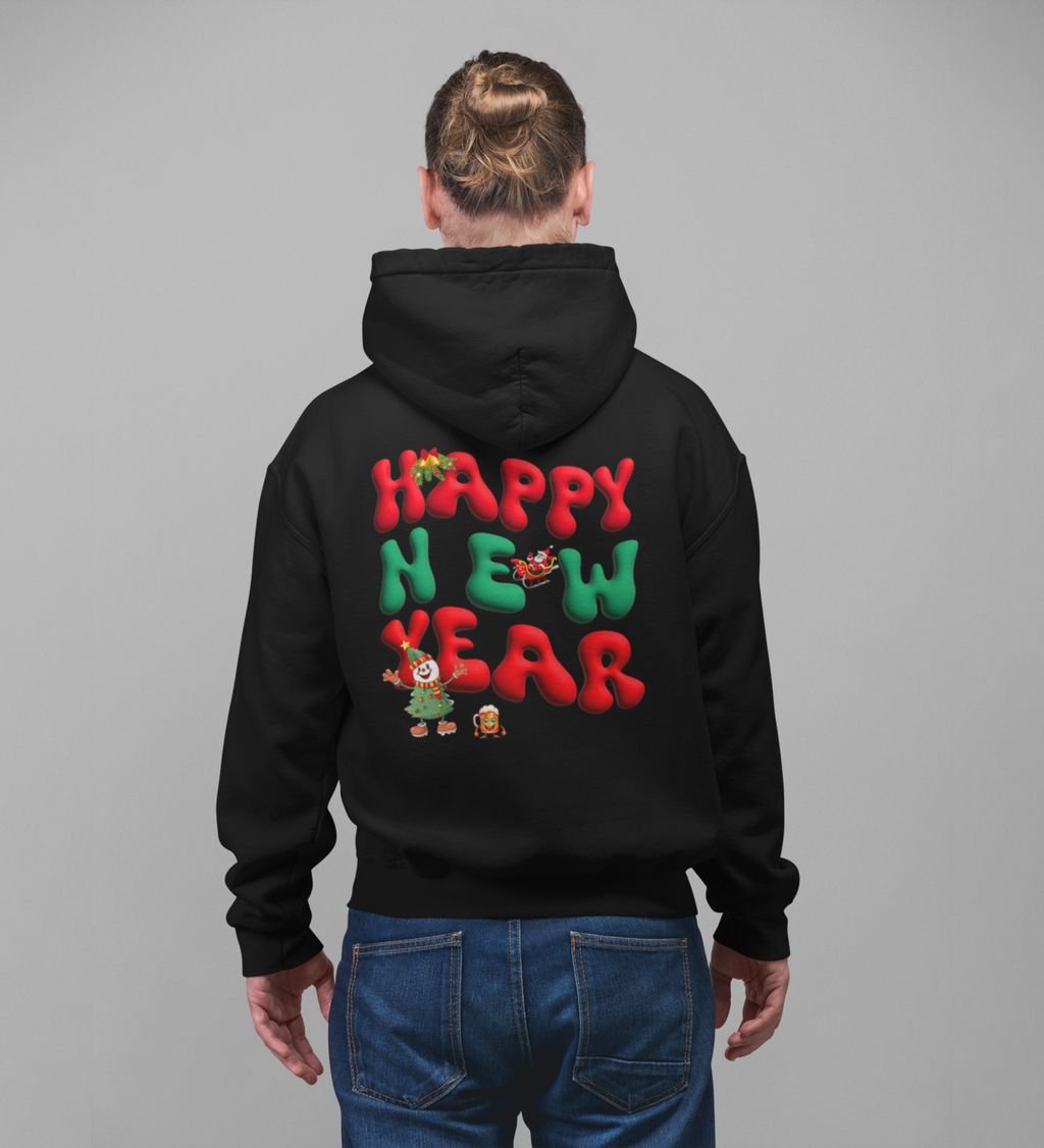 New Year Celebration with Snowman and Confetti Happy New Year Printed Black Cotton Hoodie