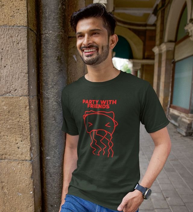 Party With Friends Green Round Neck Cotton Half Sleeved Men T Shirt with Printed Graphics