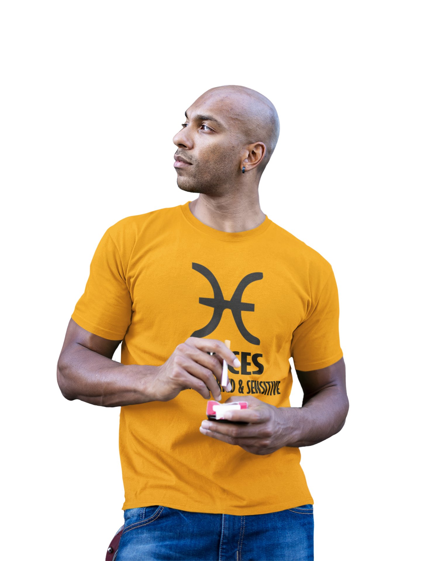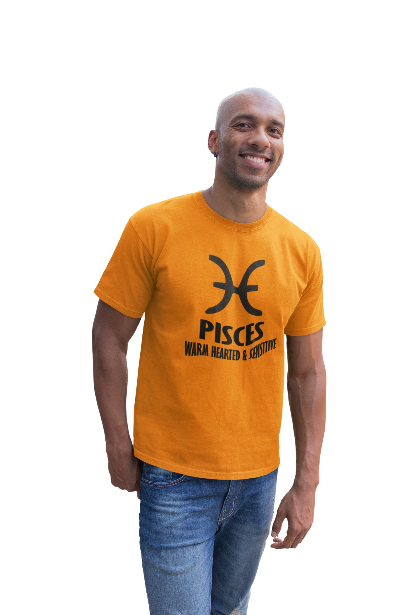 Pisces, warm hearted and sensitive (BG black) (Yellow T) - Printed Zodiac Sign Tshirts - Made especially for astrology lovers people
