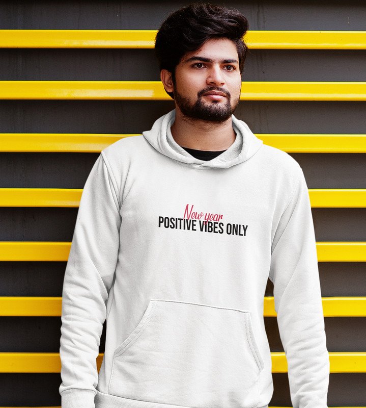 Positivity, White New Year Printed Hoodies For Mens