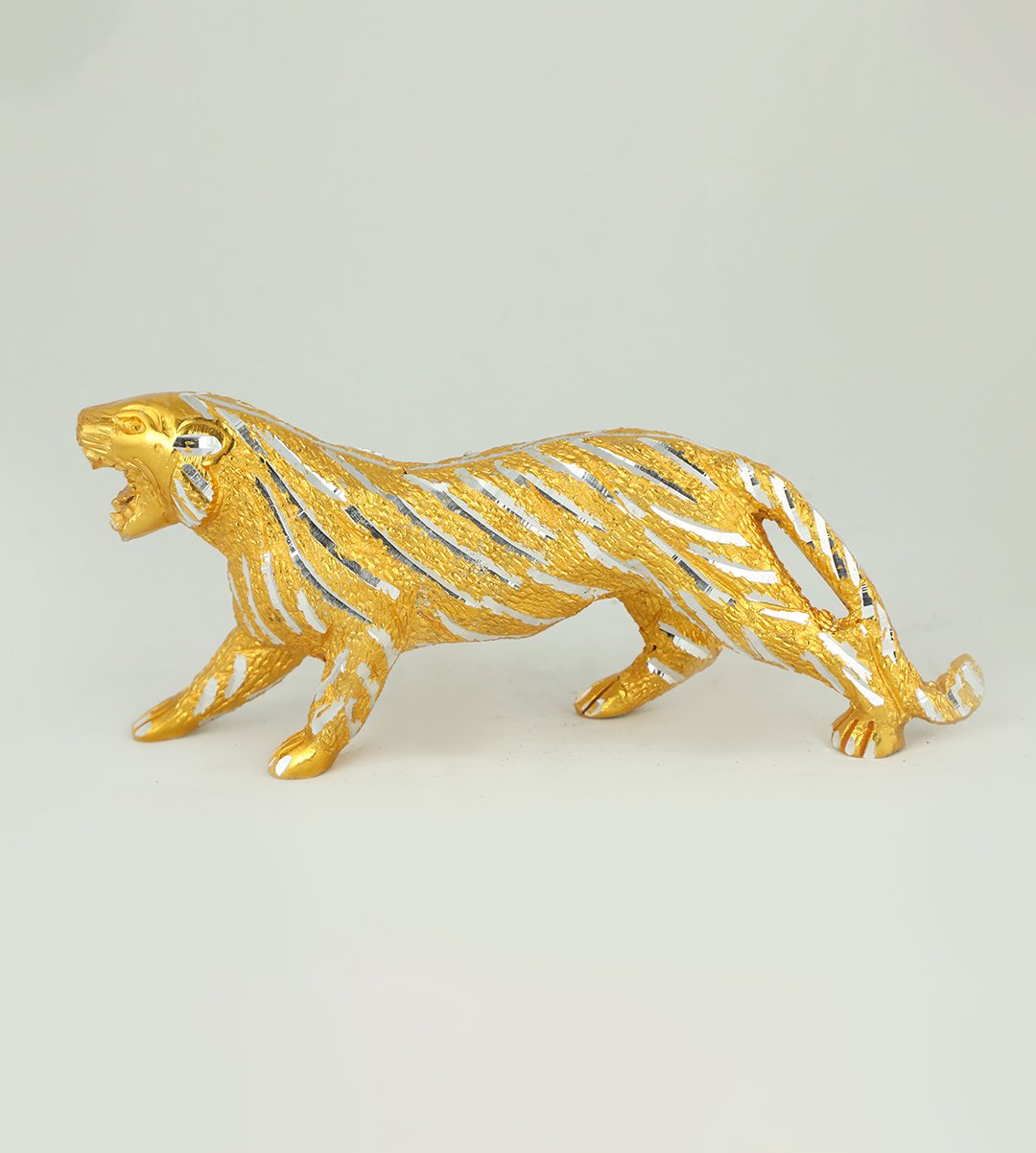 The golden tiger/ jaguar/ panther is made of special metal alloy which makes them very sturdy and durable. They are light weight and can be kept anywhere. Add an element of beauty to your home decor. It can also be an ideal addition to your living room, guest room, drawing room. It enhance the decor value of the temple, house, office, hotel, restaurent etc. It brings peace & happiness among the home members. It is very appealing and eye catching as a home decor item. It is used to keep in home's showpiece keeper, car's dashboard, receptionist's table etc It could be a memorable gift to your wedding, house warming, anniversary or festive occasions, it can be a memorable return gift.What can be a better gift than a handcrafted antique metal statue for your loved ones? Gift it to yourself or Friend, Spouse, Mother, Father, Grand Parents. Beautifully handcrafted and ornamented tiger showpiece / statue, glows with golden glitters, made with glittery material. Keep this statue at your home and office for decoration. It's also a perfect gift for the people who loves to decorate their home.
