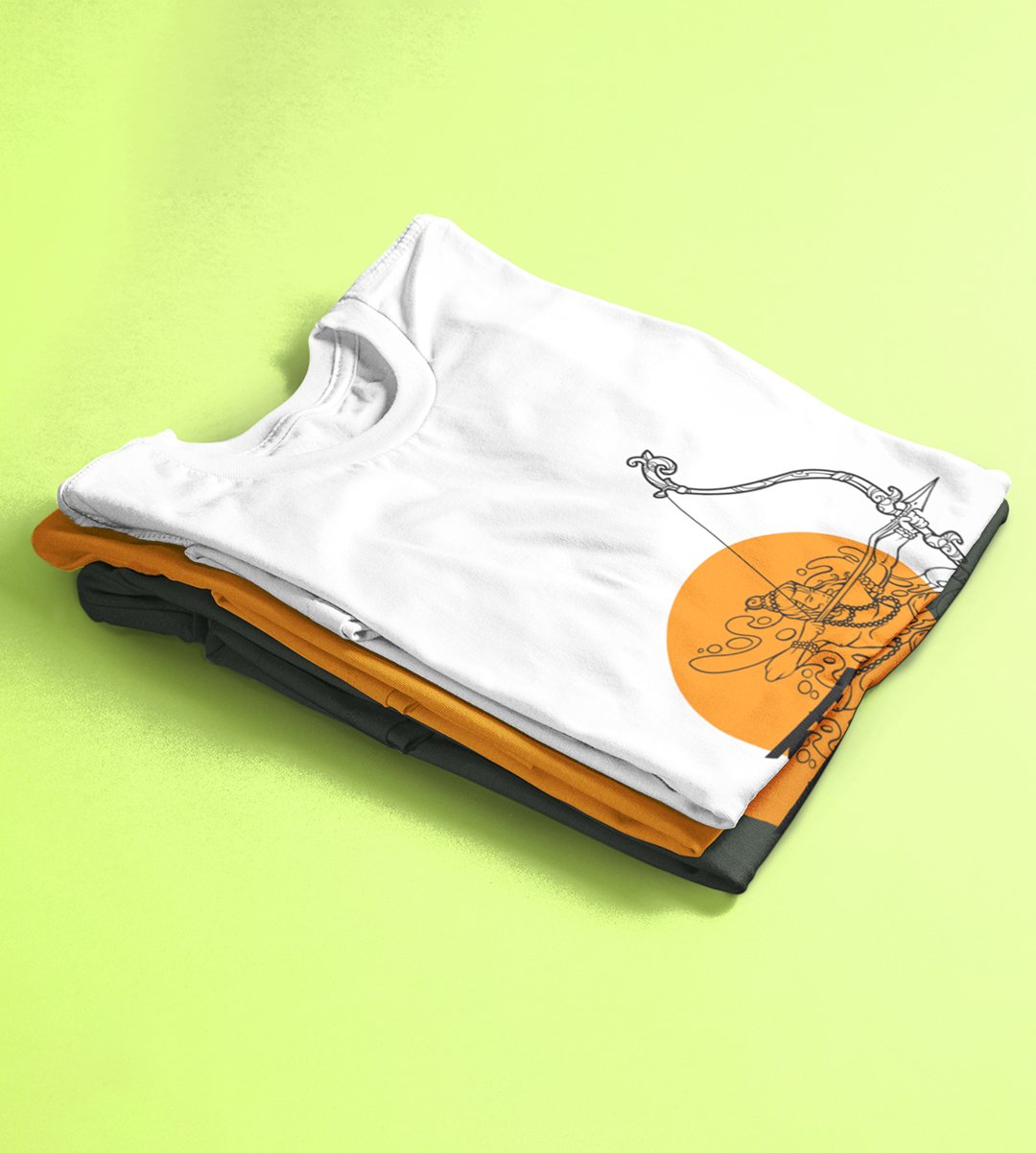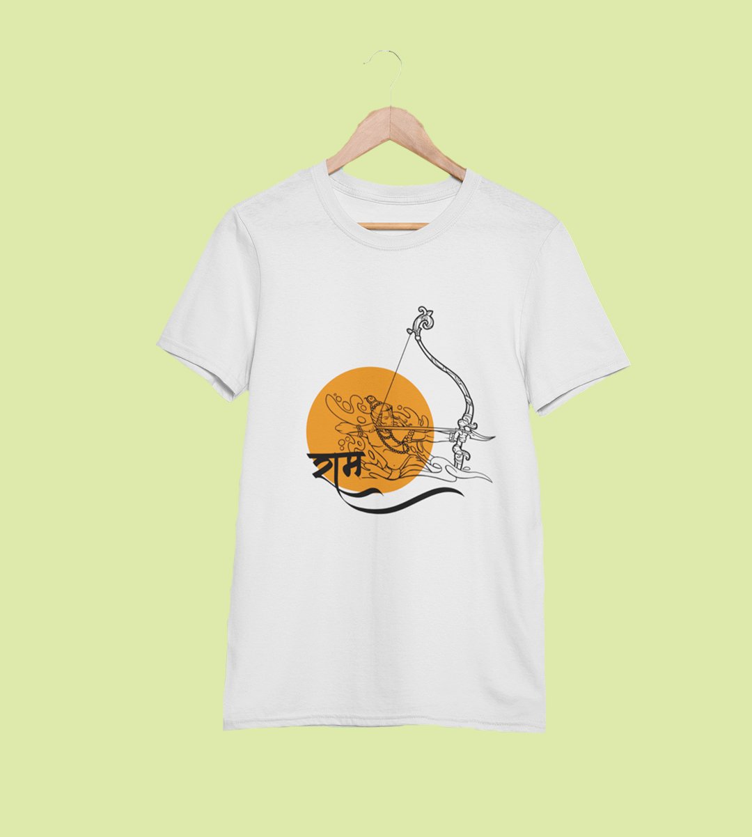 Ram and Crossbow (BG orange) printed unisex adults round neck cotton half-sleeve white tshirt specially for Navratri festival/ Durga puja