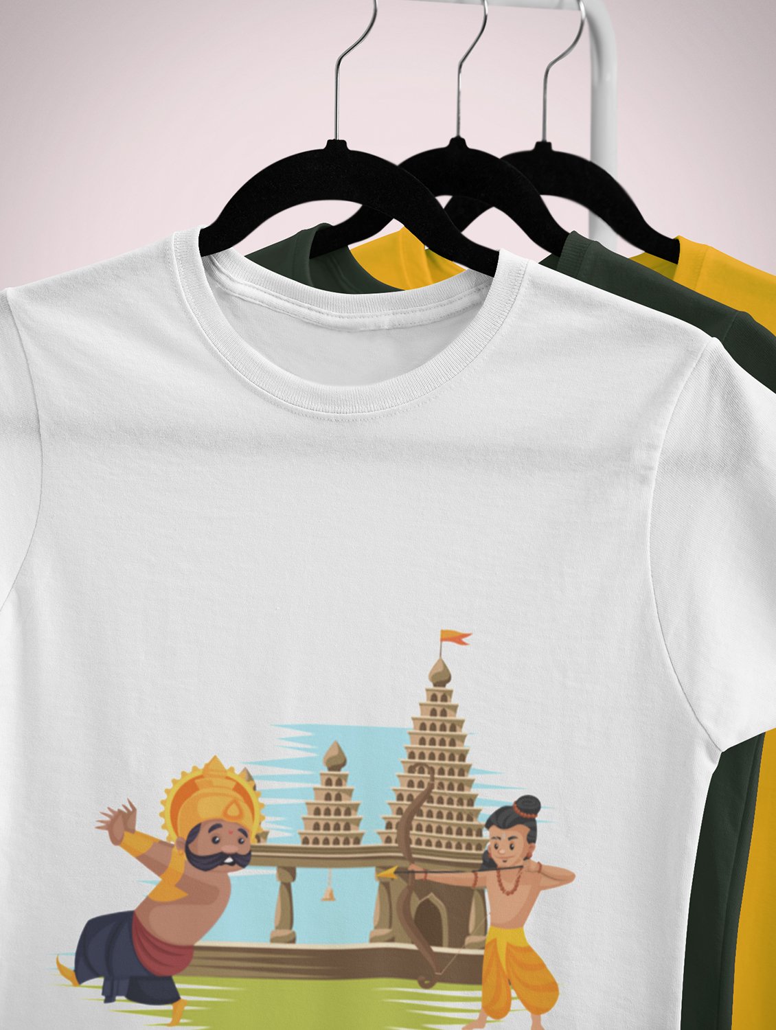 Ram and ravan animated printed unisex adults round neck cotton half-sleeve white tshirt specially for Navratri festival/ Durga puja
