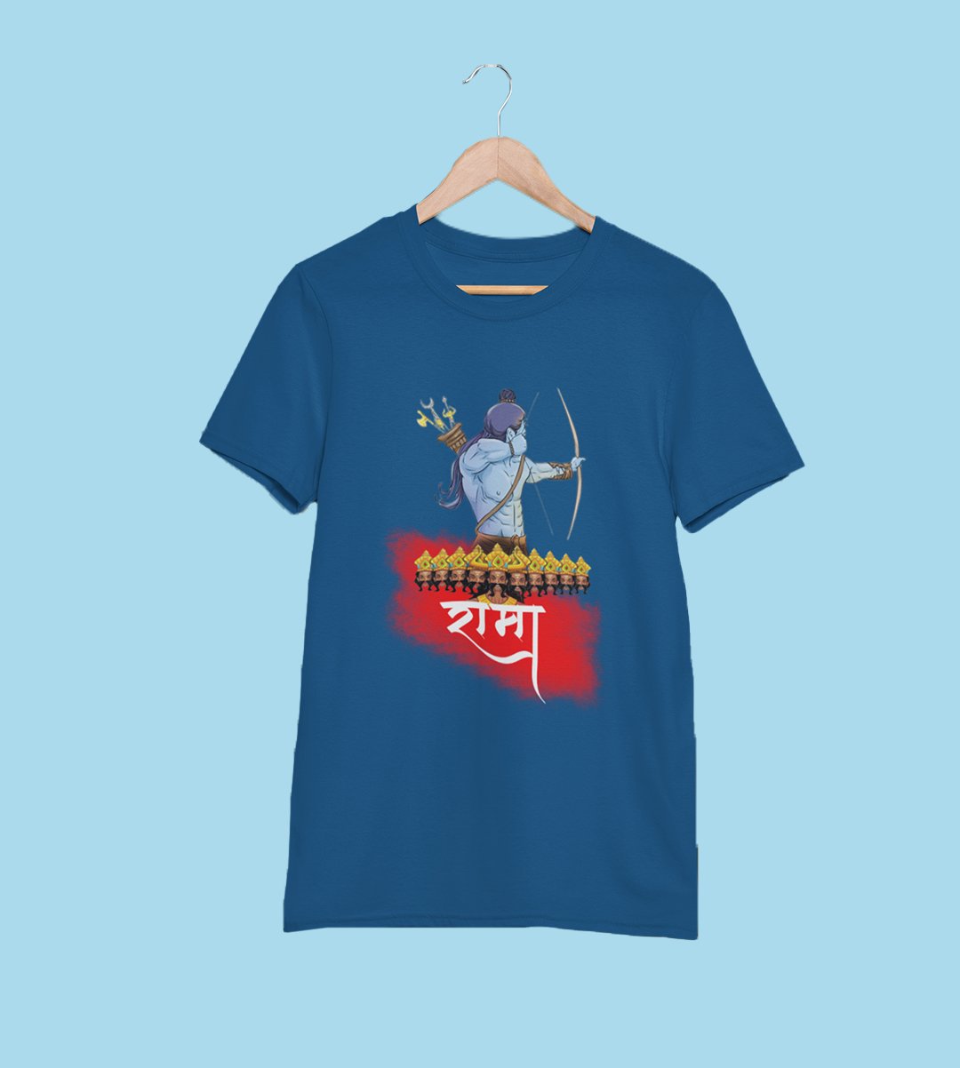 Ram and Ravan printed unisex adults round neck cotton half-sleeve blue tshirt specially for Navratri festival/ Durga puja