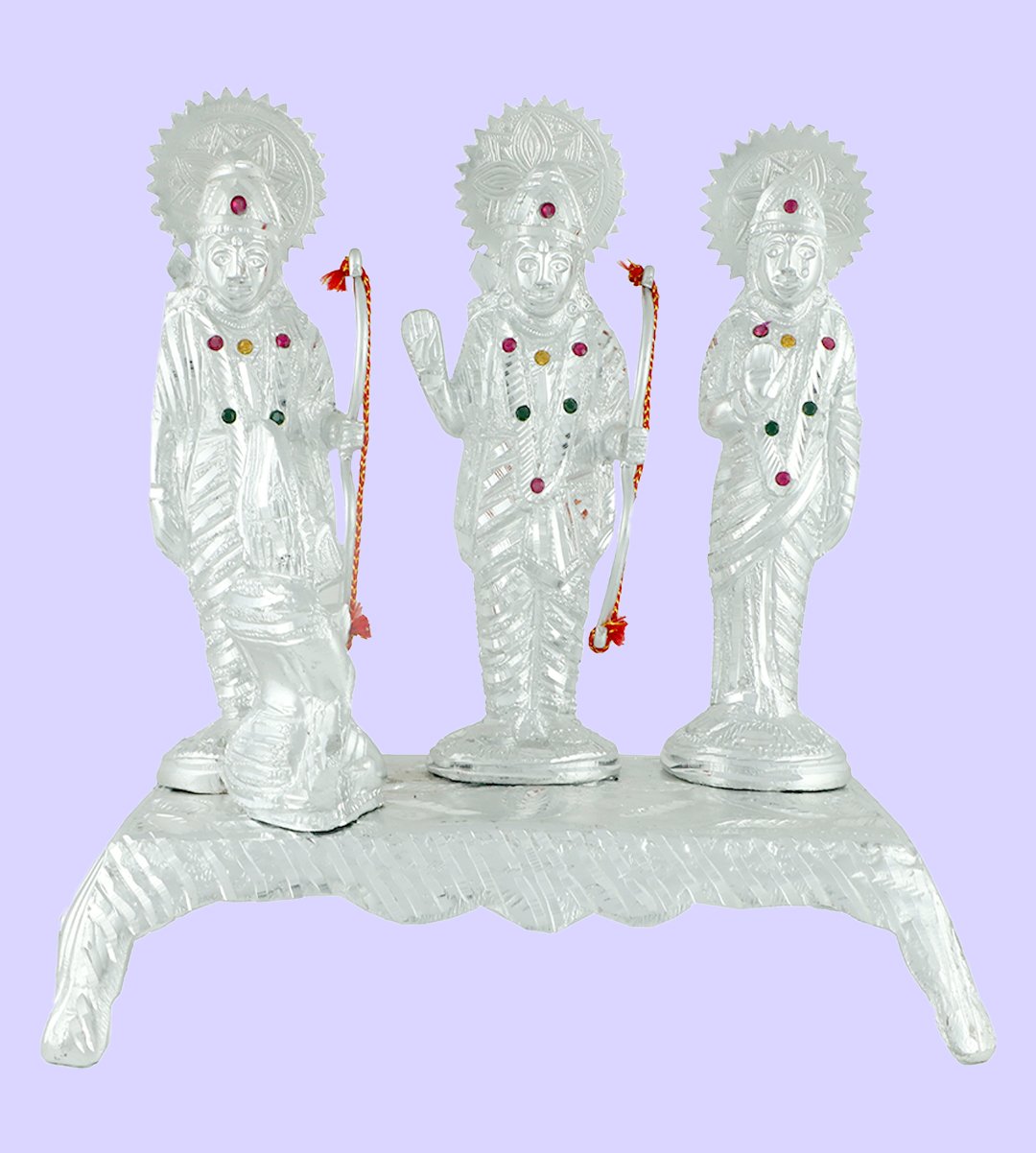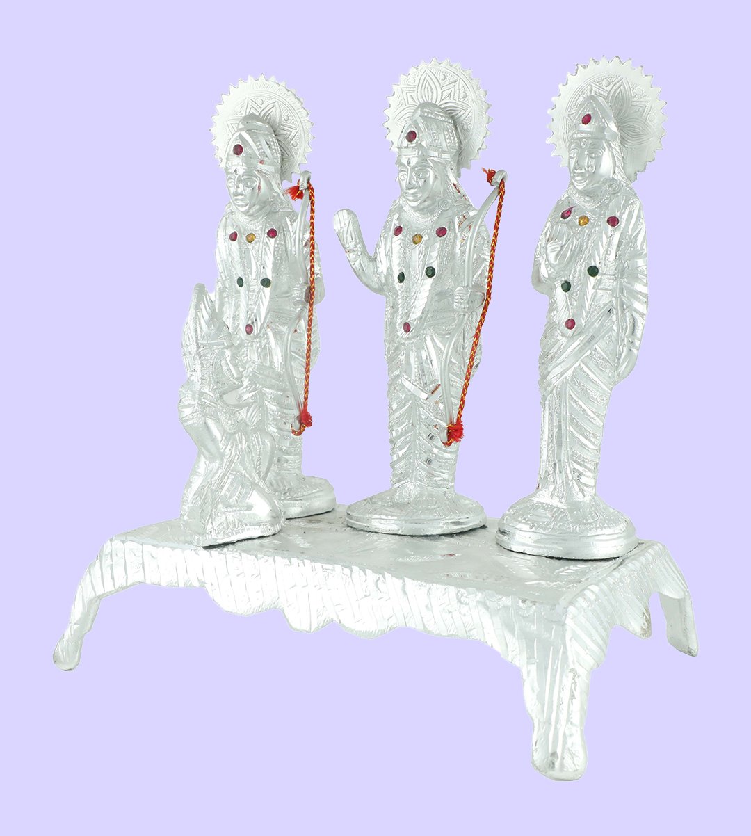 Sterling metal silver colour decorative lord ram, laxman and seeta figurine/ murti which is a work of art. This elegant, sterling, silver decorative lord ram, laxman and seeta figurine depicts elegance, artistic brilliance and spirituality. It can be placed on your home, car's dashboard and pooja ghar to bring positivity, mental health, peace and happiness among the home members. Replete with minute detailing, fine carving and embedded gemstones, add positivity, spiritual vibes and peaceful meditating atmosphere to your home or vehicle's dashboard with this elegant masterpiece. Don't wash, use dry cotton cloth to remove dirt.