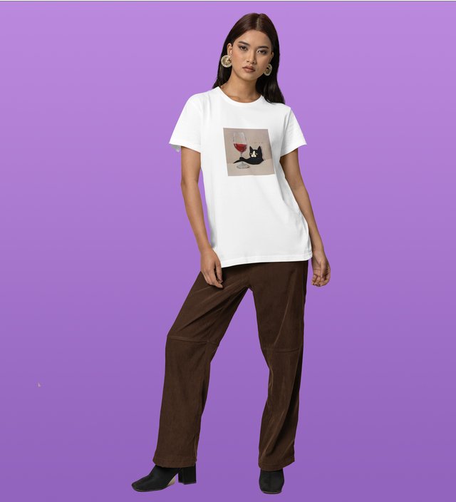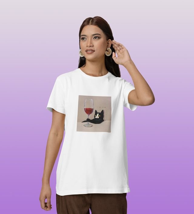 Refined Rebellion: Feline Wine Moment Graphic Printed White T-Shirt