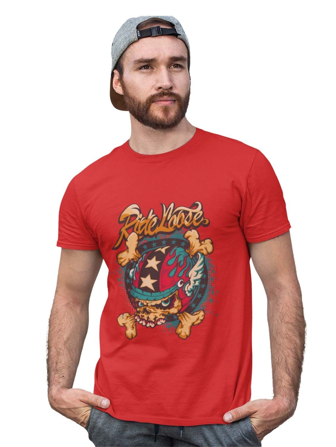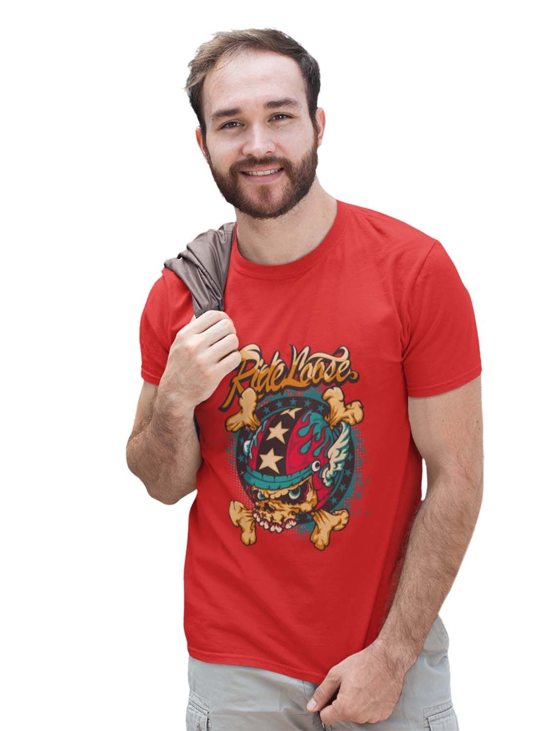 Ride Loose, (BG Yellow) Red Round Neck Cotton Half Sleeved T-Shirt with Printed Graphics