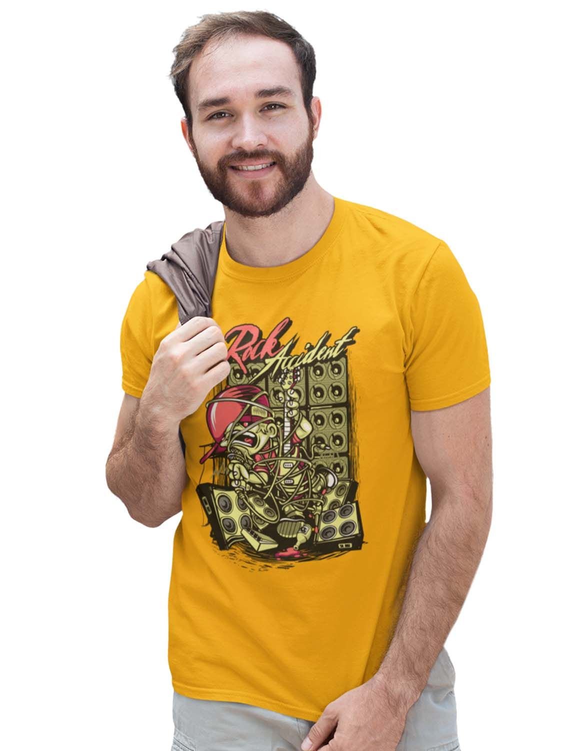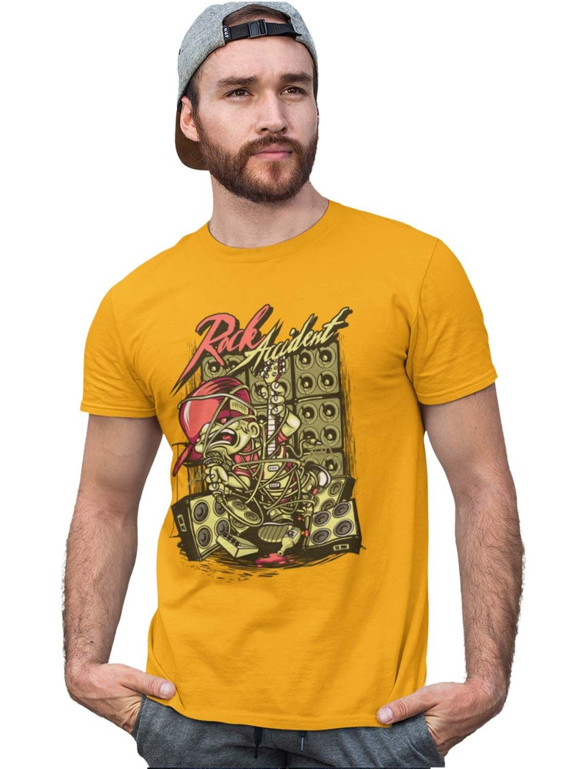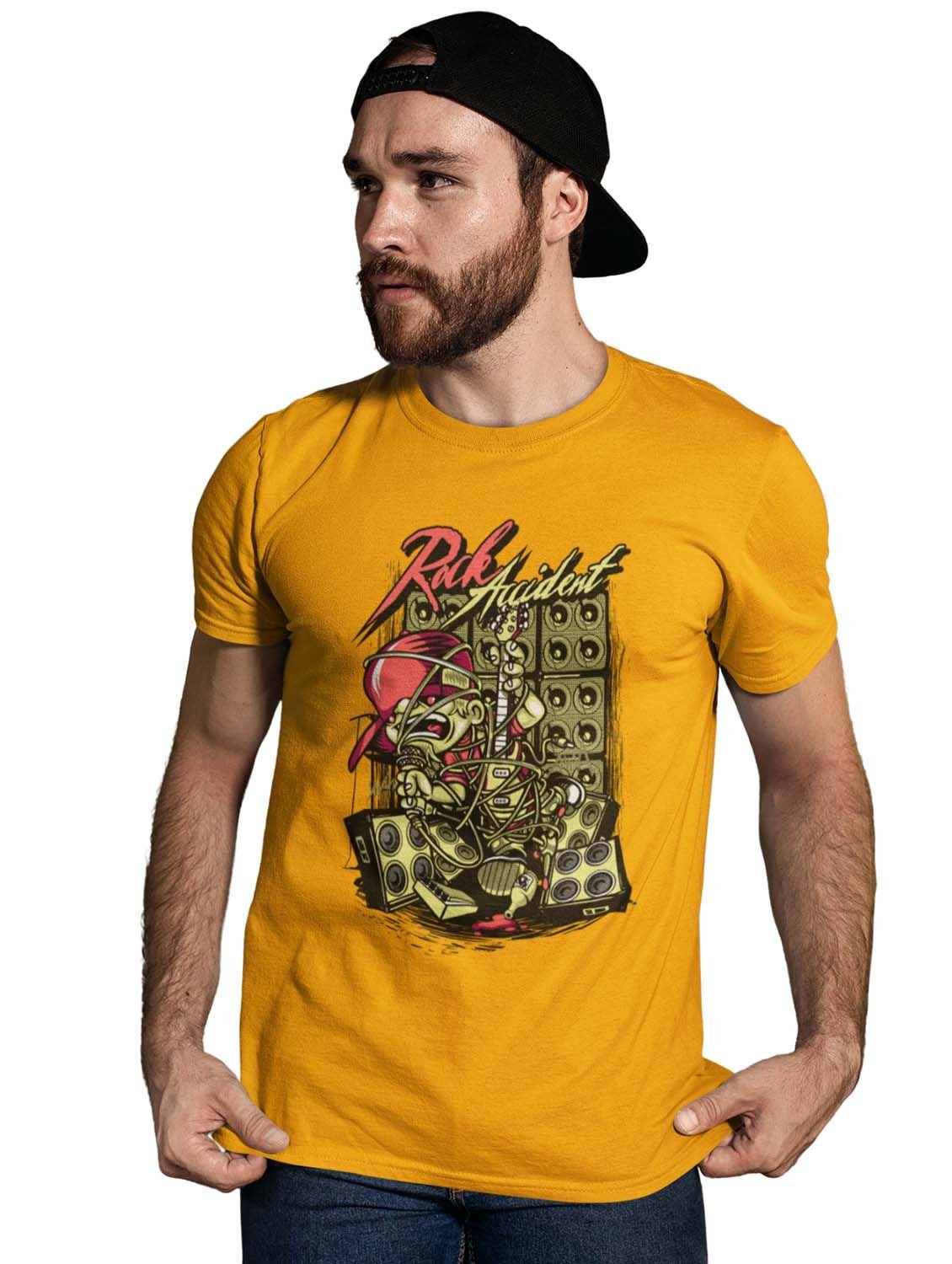 Rock Accident Yellow Round Neck Cotton Half Sleeved T-Shirt with Printed Graphics