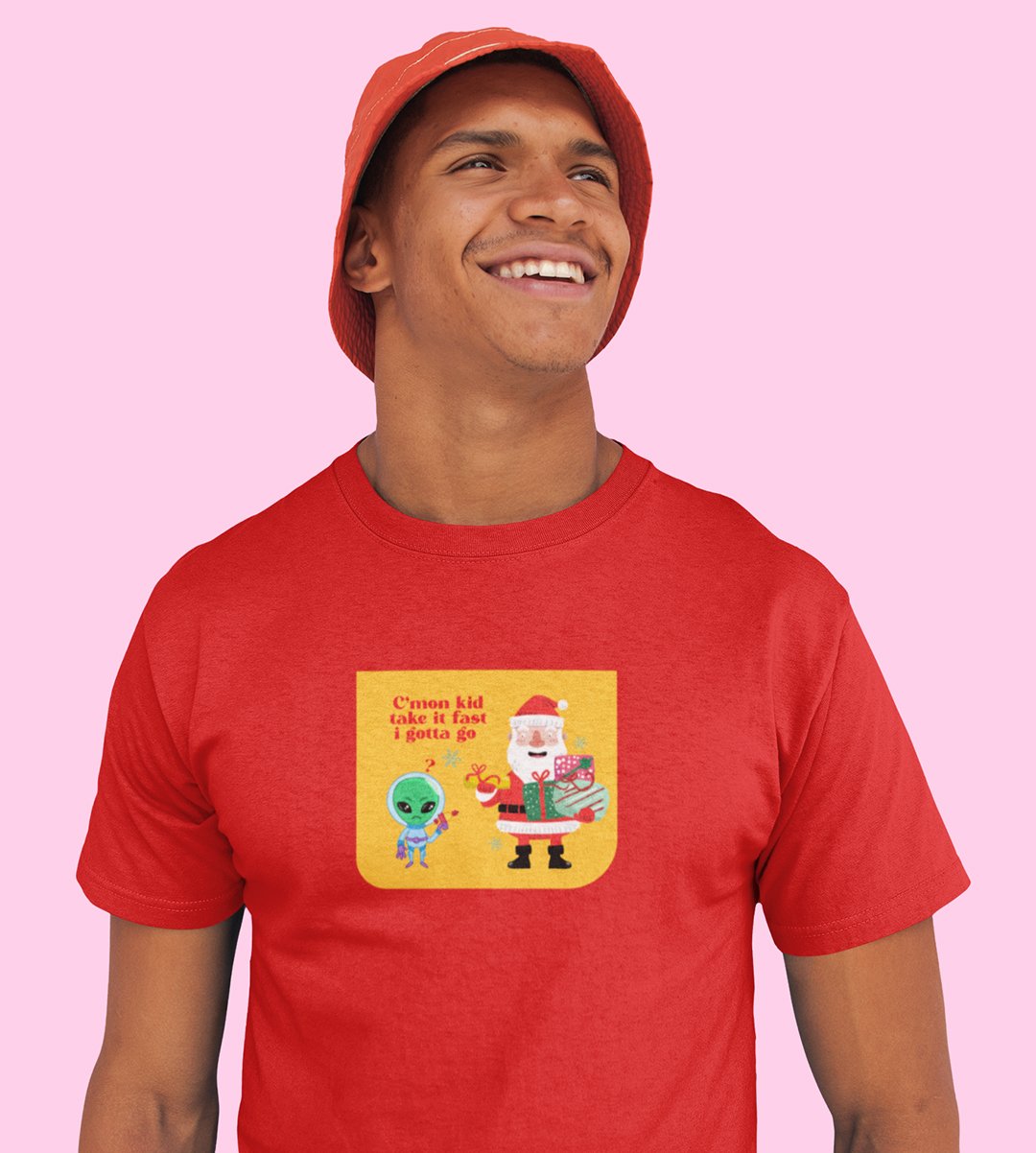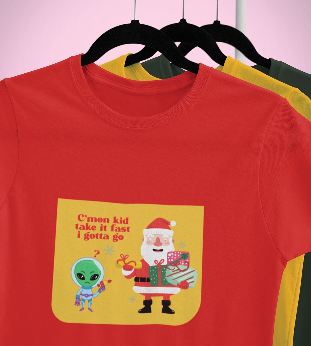 Santa And Alien's Talk : Elegantly Printed T-shirt (Red) Best Gift For Boys Girls