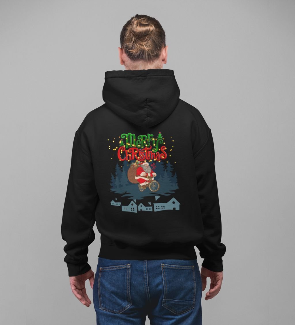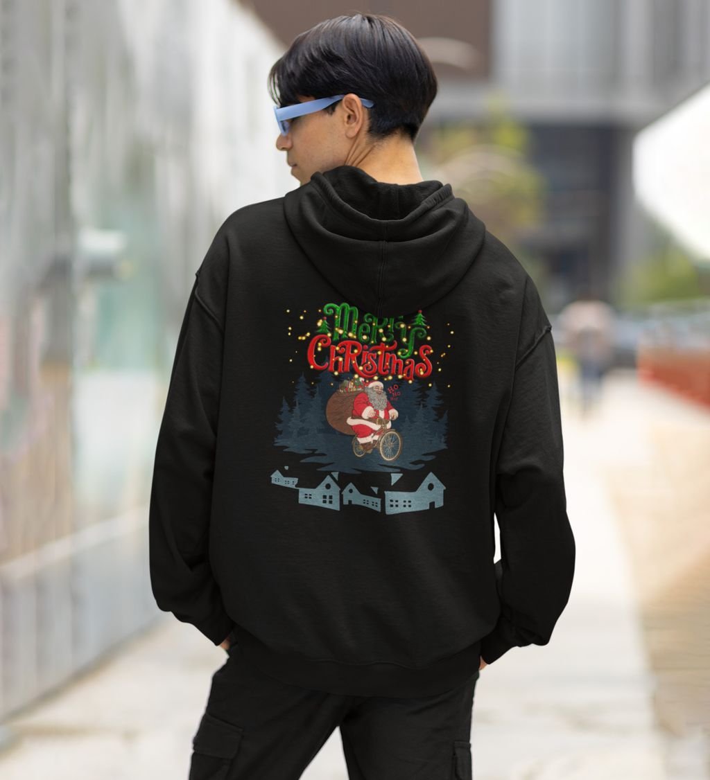 Santa Happily Riding a Bicycle Filled with Gifts Printed Black Cotton Hoodie