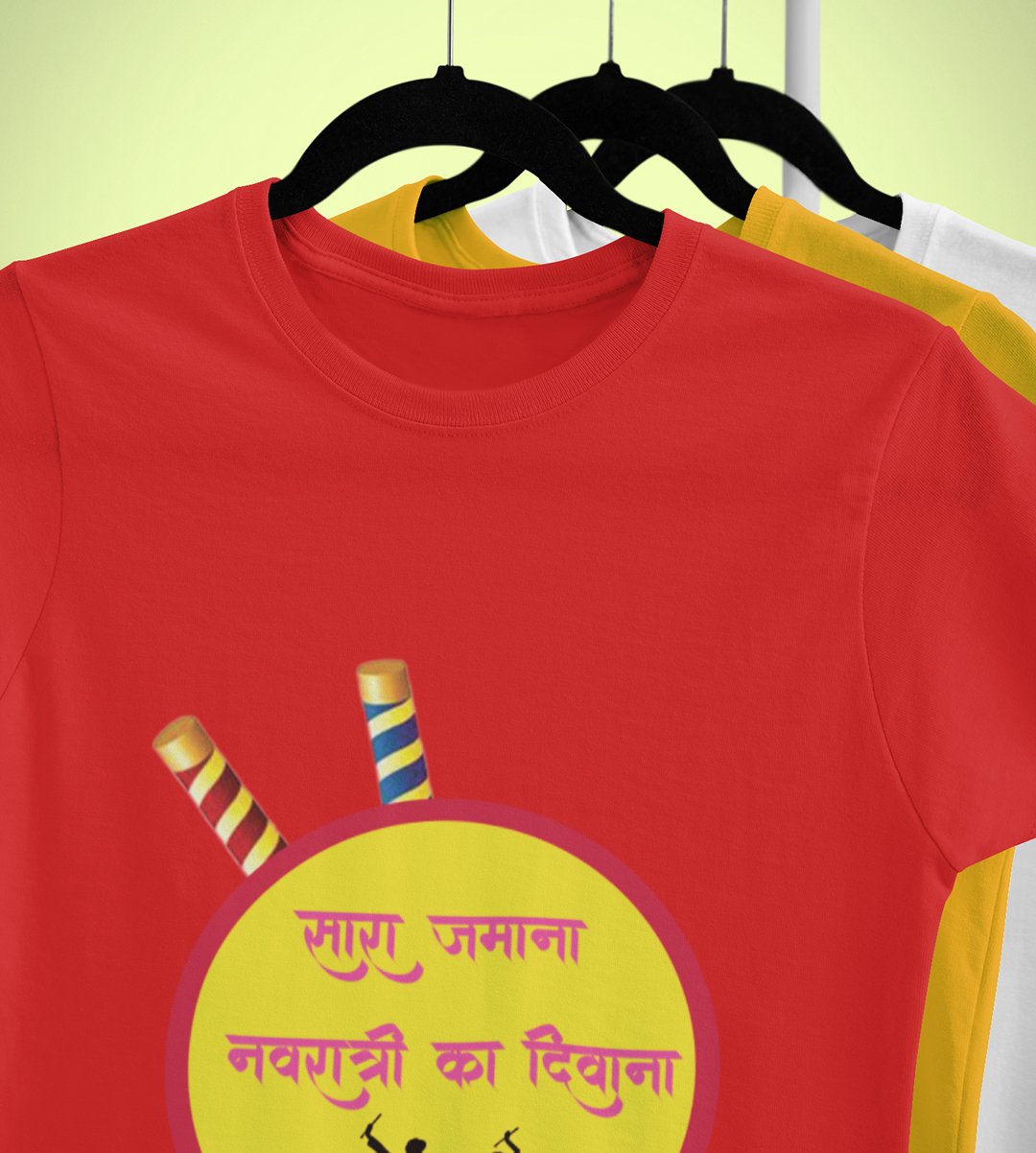 Navratri is a very auspicious festival for hindus. It takes place at the beginning of October and sometimes September. Enjoy the 9 days of festivities with full zeal and make yourself submerged in the love of Maa Durga. Navratri is also known as Durga Puja. And with this Tees, you can shine like a star during this festive season with our navratri themed cotton half sleeved Tshirts. You can pair our t-shirts with trousers and denim of your choice and make it a weekday smart casual or weekend wear. This is durable. This tshirt is smooth and soft which makes you comfortable to wear during all seasons. The printing in it is durable and odourless. It has five sizes, S,M,L,XL,XXL. The Tshirt colour is intact even after repeated washes. It can be kept in your wardrobe and hangers. Please avoid washing mashine to clean this Tee, it may affect the print. Hand wash only. We have brought you many navratri related designs printed on our different colour Tshirts to choose from. Grab it now.
