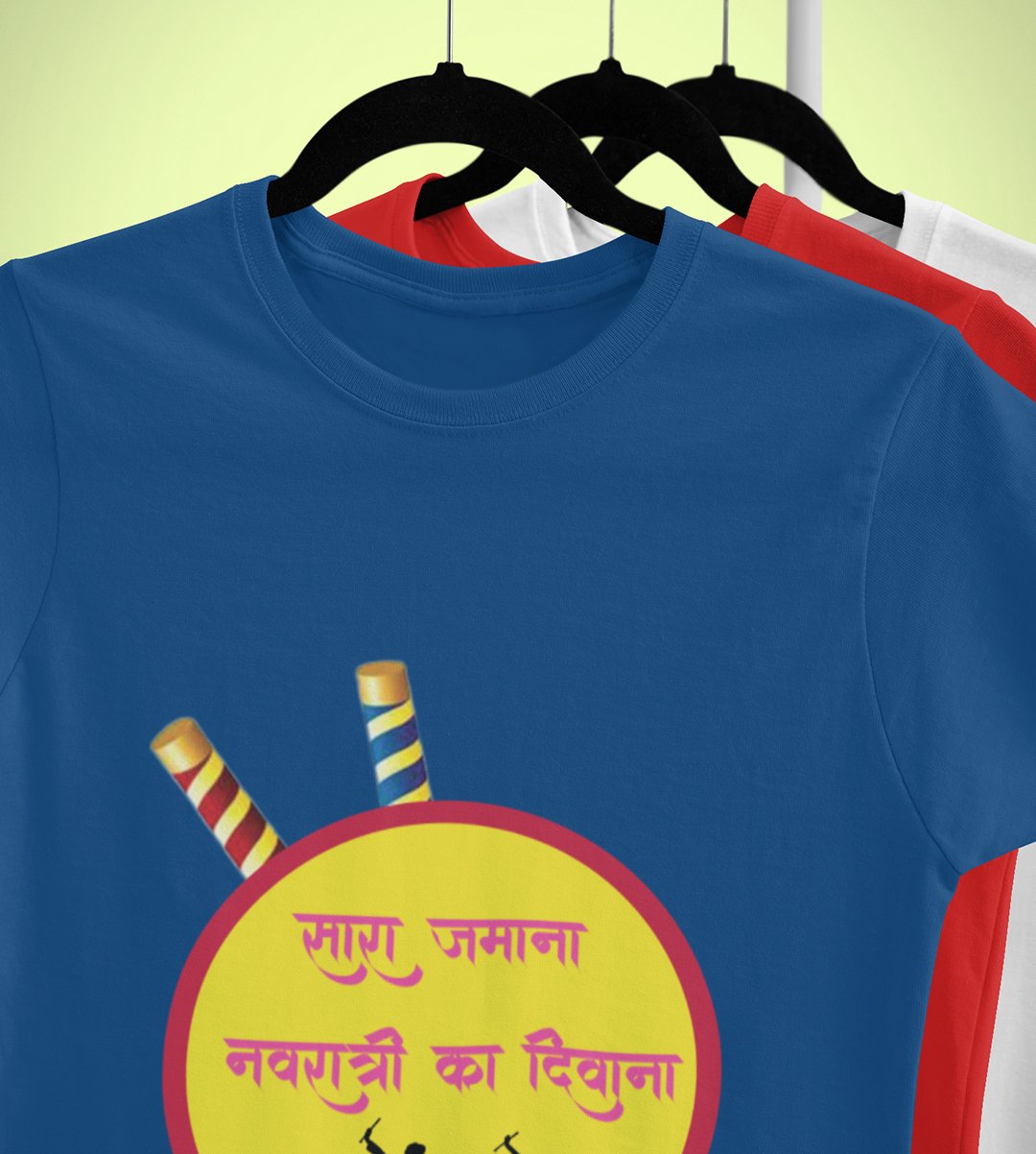 Navratri is a very auspicious festival for hindus. It takes place at the beginning of October and sometimes September. Enjoy the 9 days of festivities with full zeal and make yourself submerged in the love of Maa Durga. Navratri is also known as Durga Puja. And with this Tees, you can shine like a star during this festive season with our navratri themed cotton half sleeved Tshirts. You can pair our t-shirts with trousers and denim of your choice and make it a weekday smart casual or weekend wear. This is durable. This tshirt is smooth and soft which makes you comfortable to wear during all seasons. The printing in it is durable and odourless. It has five sizes, S,M,L,XL,XXL. The Tshirt colour is intact even after repeated washes. It can be kept in your wardrobe and hangers. Please avoid washing mashine to clean this Tee, it may affect the print. Hand wash only. We have brought you many navratri related designs printed on our different colour Tshirts to choose from. Grab it now.