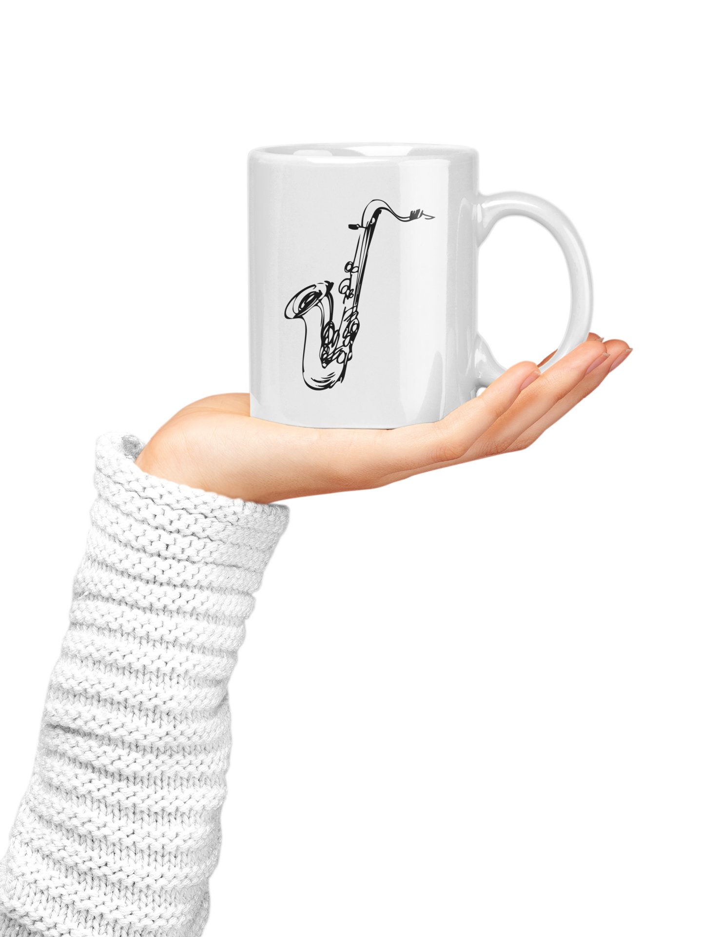 Black Sexaphone- music themed printed ceramic white coffee and tea mugs/ cups for music lovers