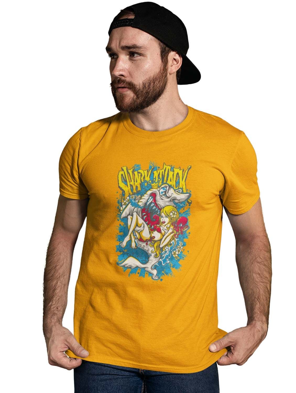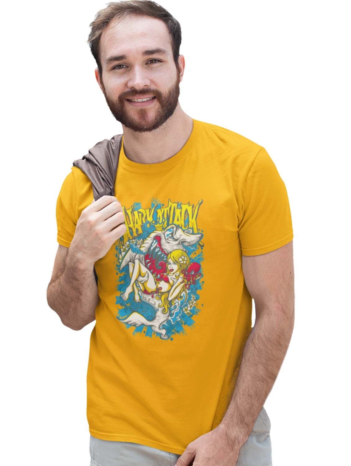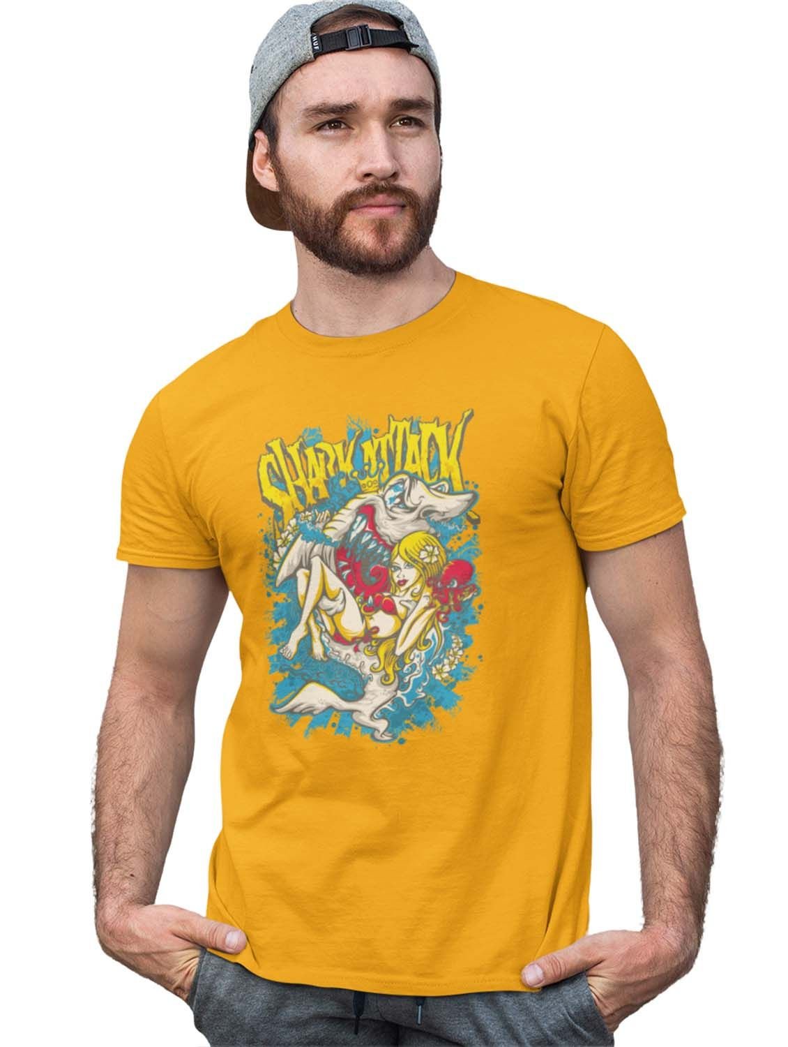 Shark Attack Yellow Round Neck Cotton Half Sleeved T-Shirt with Printed Graphics