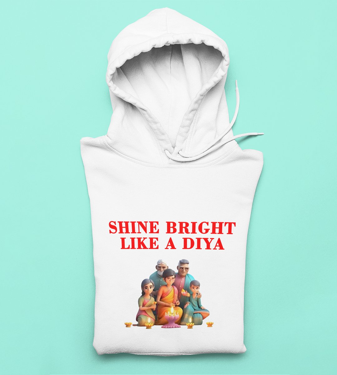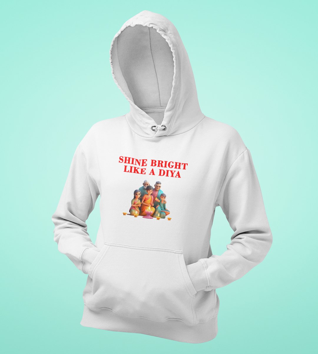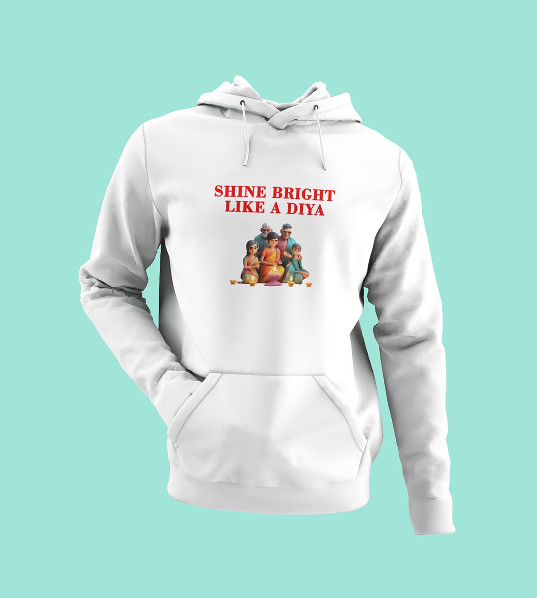 Embrace the luminous spirit of Diwali with our "Shine Bright Like A Diya" White Hoodie . The heartwarming design captures the essence of family celebrating the festival, radiating the warmth and togetherness that defines Diwali. Sip your and bask in the glow of Diwali with this heartwarming White Hoodie .
