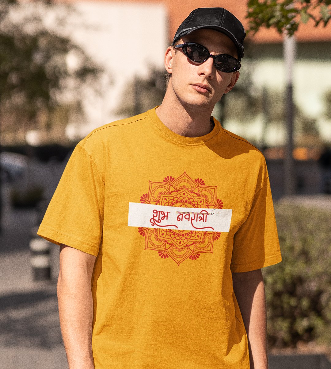 Shubh Navratri (Mandala) printed unisex adults round neck cotton half-sleeve yellow tshirt specially for Navratri festival/ Durga puja