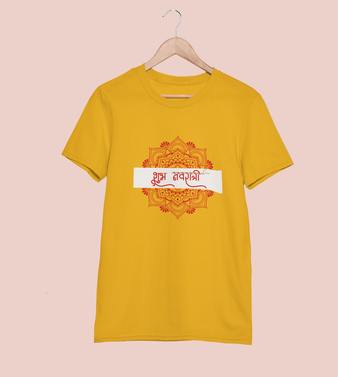 Navratri is a very auspicious festival for hindus. It takes place at the beginning of October and sometimes September. Enjoy the 9 days of festivities with full zeal and make yourself submerged in the love of Maa Durga. Navratri is also known as Durga Puja. And with this Tees, you can shine like a star during this festive season with our navratri themed cotton half sleeved Tshirts. You can pair our t-shirts with trousers and denim of your choice and make it a weekday smart casual or weekend wear. This is durable. This tshirt is smooth and soft which makes you comfortable to wear during all seasons. The printing in it is durable and odourless. It has five sizes, S,M,L,XL,XXL. The Tshirt colour is intact even after repeated washes. It can be kept in your wardrobe and hangers. Please avoid washing mashine to clean this Tee, it may affect the print. Hand wash only. We have brought you many navratri related designs printed on our different colour Tshirts to choose from. Grab it now.