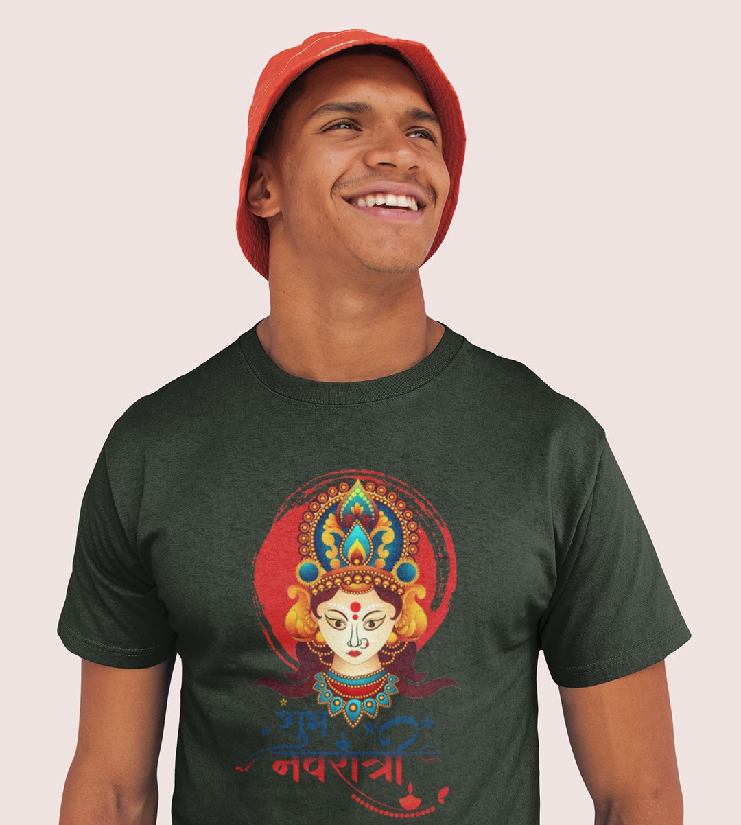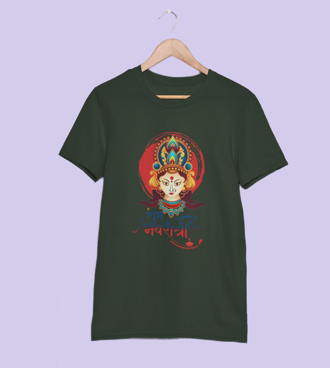 Navratri is a very auspicious festival for hindus. It takes place at the beginning of October and sometimes September. Enjoy the 9 days of festivities with full zeal and make yourself submerged in the love of Maa Durga. Navratri is also known as Durga Puja. And with this Tees, you can shine like a star during this festive season with our navratri themed cotton half sleeved Tshirts. You can pair our t-shirts with trousers and denim of your choice and make it a weekday smart casual or weekend wear. This is durable. This tshirt is smooth and soft which makes you comfortable to wear during all seasons. The printing in it is durable and odourless. It has five sizes, S,M,L,XL,XXL. The Tshirt colour is intact even after repeated washes. It can be kept in your wardrobe and hangers. Please avoid washing mashine to clean this Tee, it may affect the print. Hand wash only. We have brought you many navratri related designs printed on our different colour Tshirts to choose from. Grab it now.