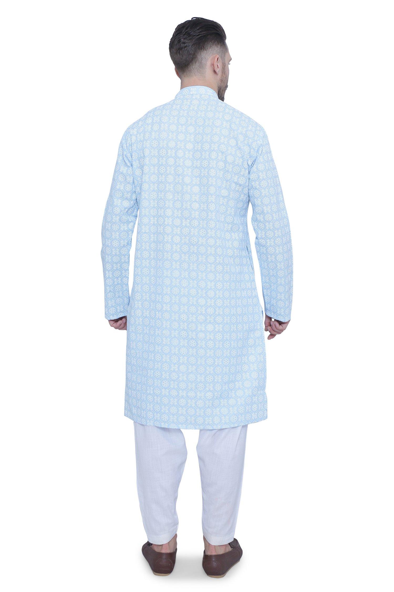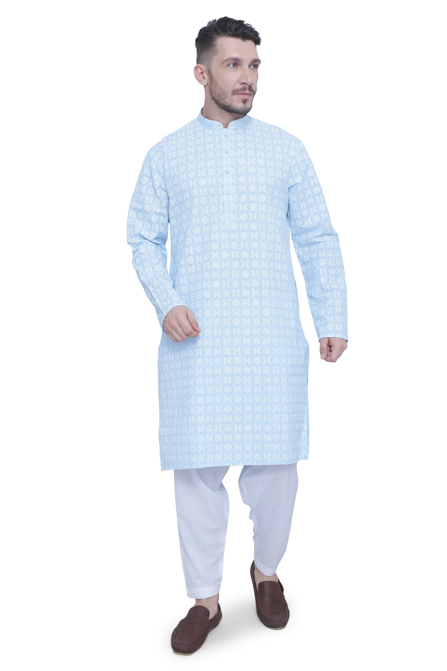 Elevate your summer wardrobe with our Sky Blue Cotton Men's Kurta, a versatile choice for every occasion. Crafted from pure cotton, this kurta offers cool comfort and breathability even on the warmest days. The subtle yet stylish floral print adds a touch of sophistication to your look. Embrace the soothing elegance of our Sky Blue Cotton Men's Kurta. The combination of pure cotton, a refreshing color, and floral print makes it a versatile choice for your summer wardrobe. Stay comfortable and stylish in this unique kurta that's perfect for any occasion.