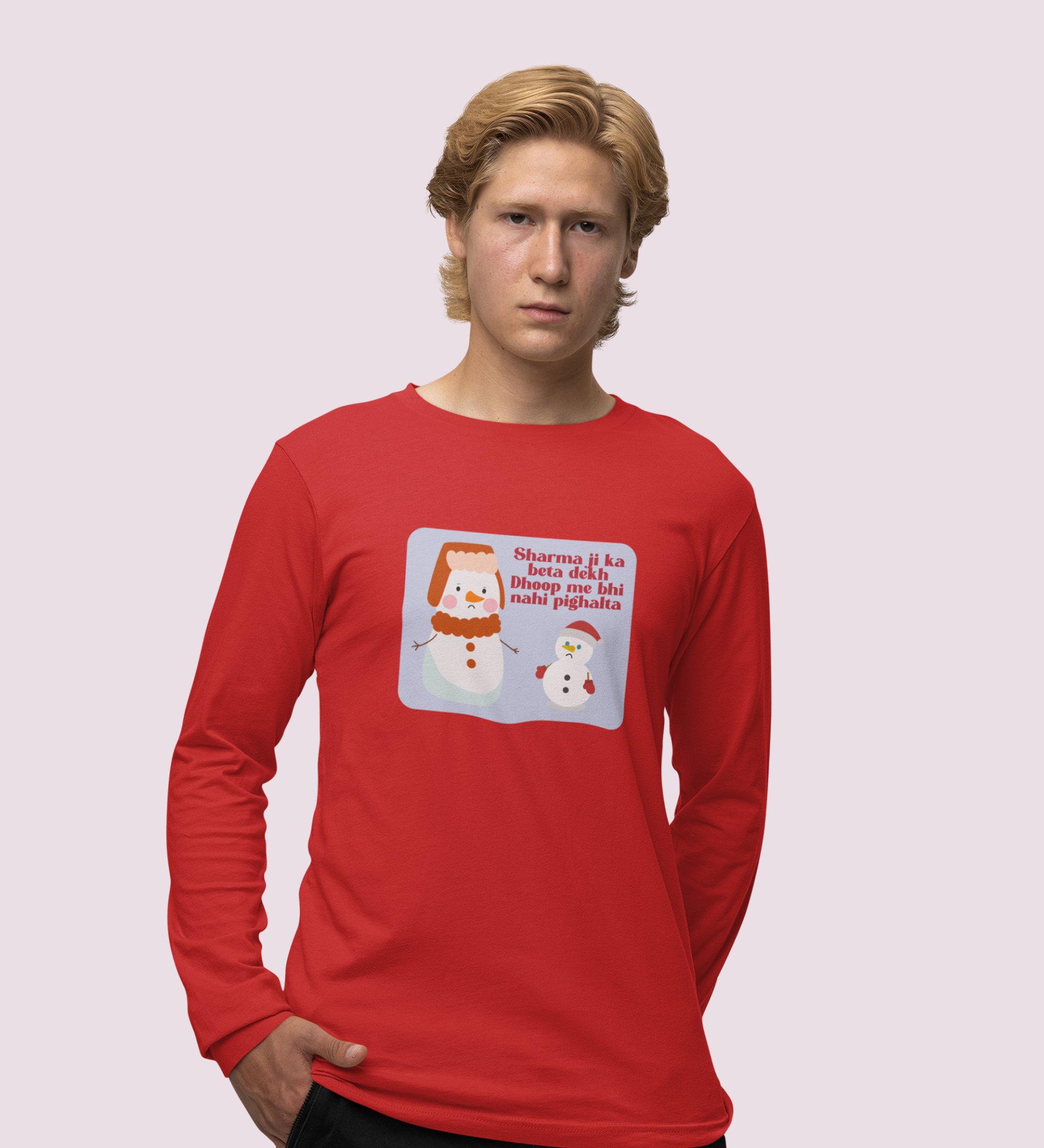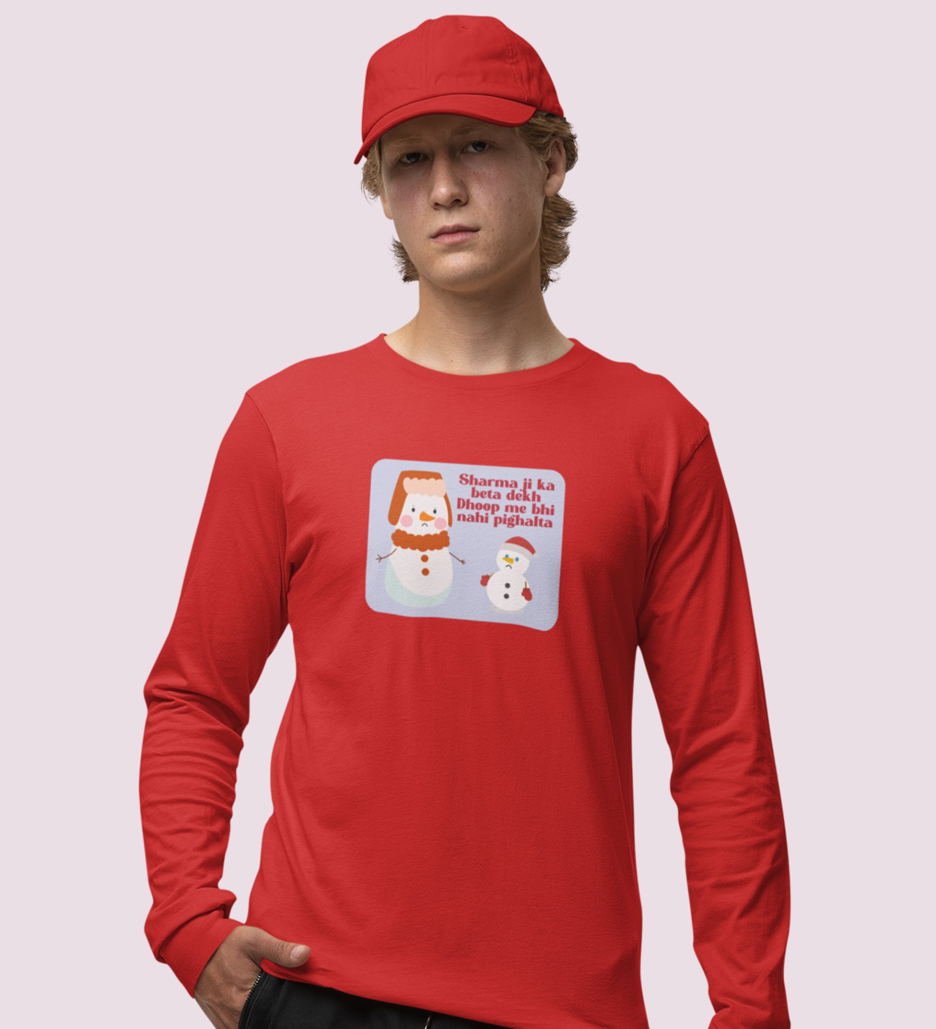Snowman Sharmaji: Funny DesignerFull Sleeve T-shirt Red Perfect Gift For Secret Santa