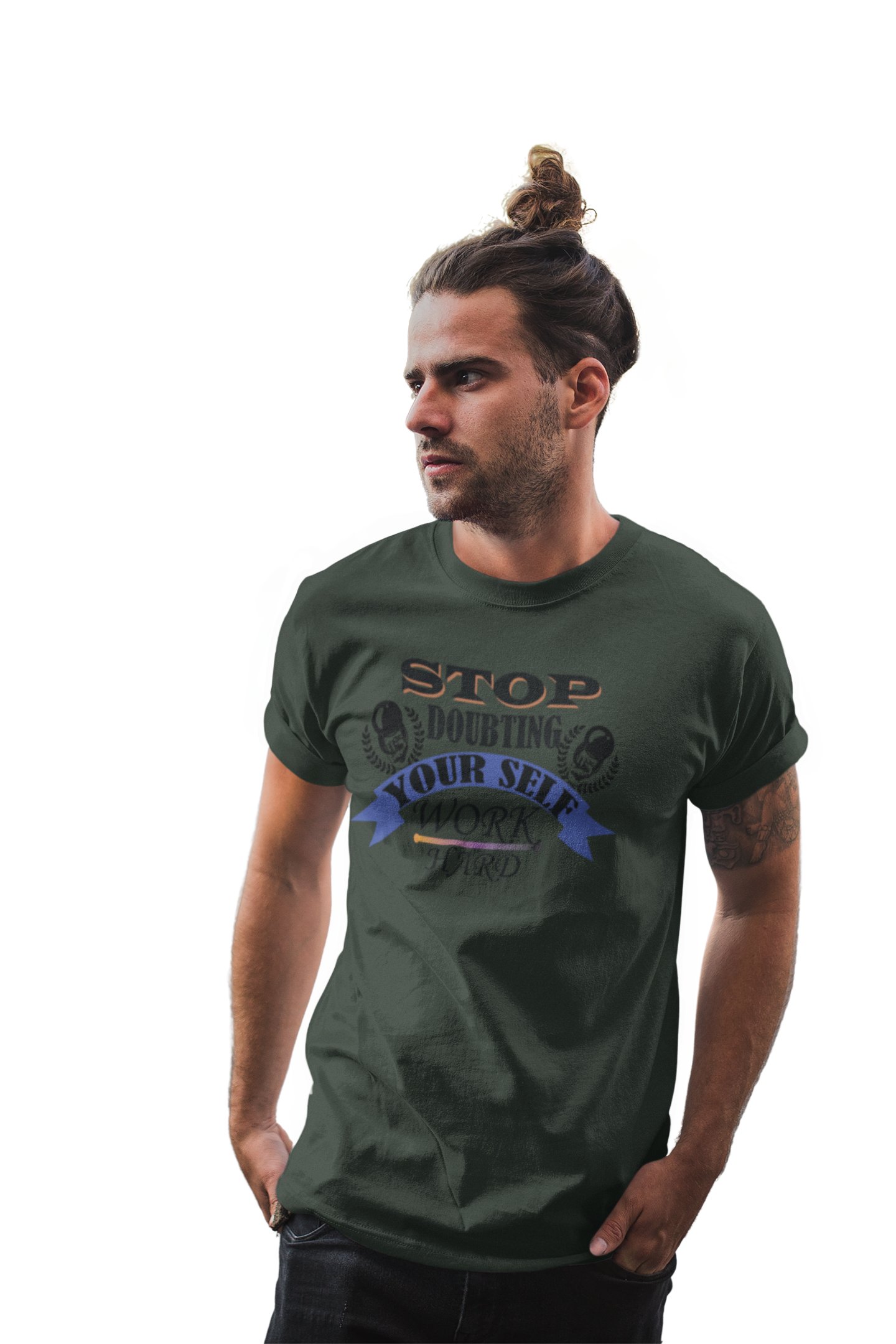 Stop Doubting Yourself, Work Hard, (BG Black), Round Neck Gym Tshirt - Foremost Gifting Material for Your Friends and Close Ones