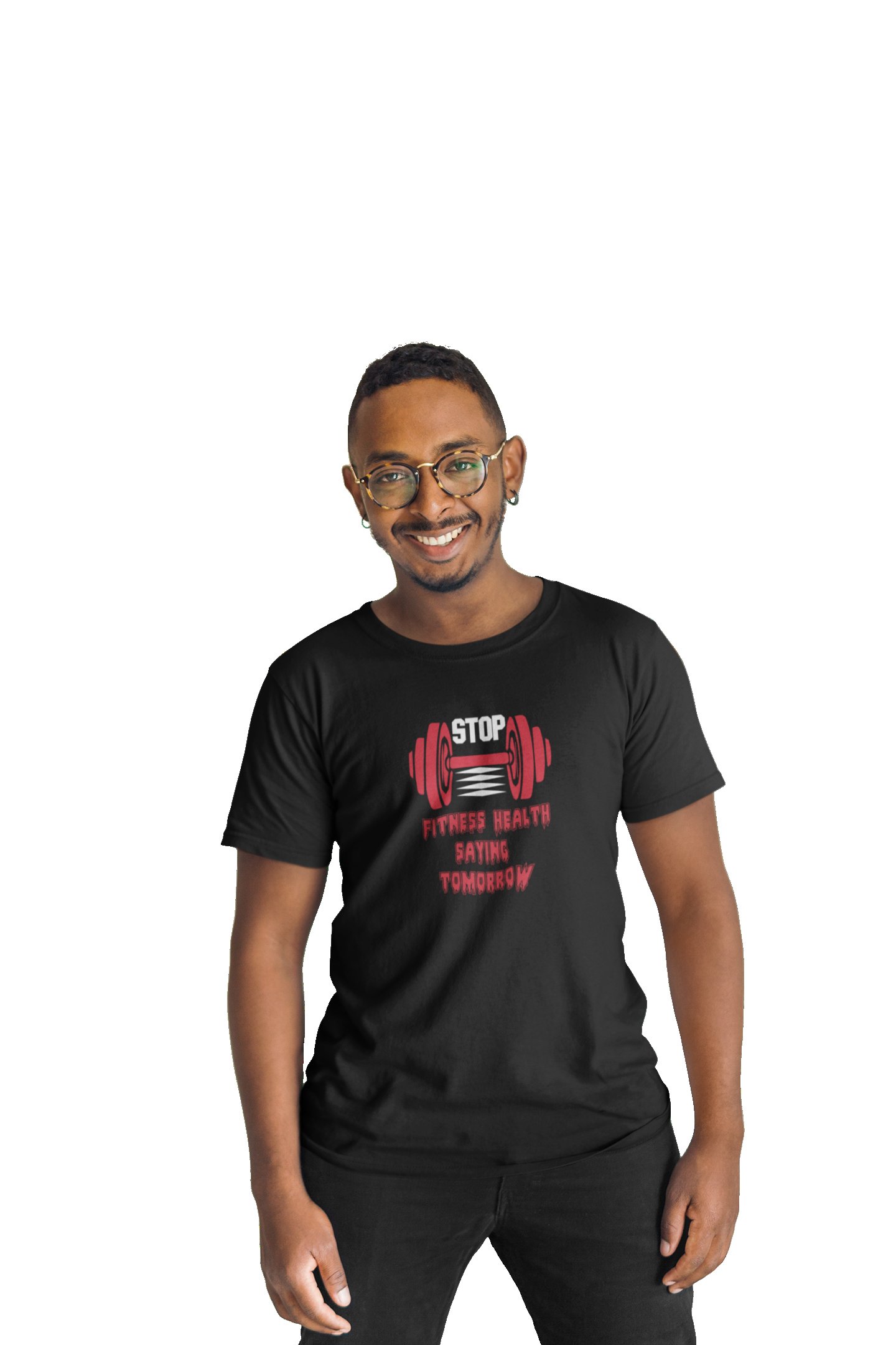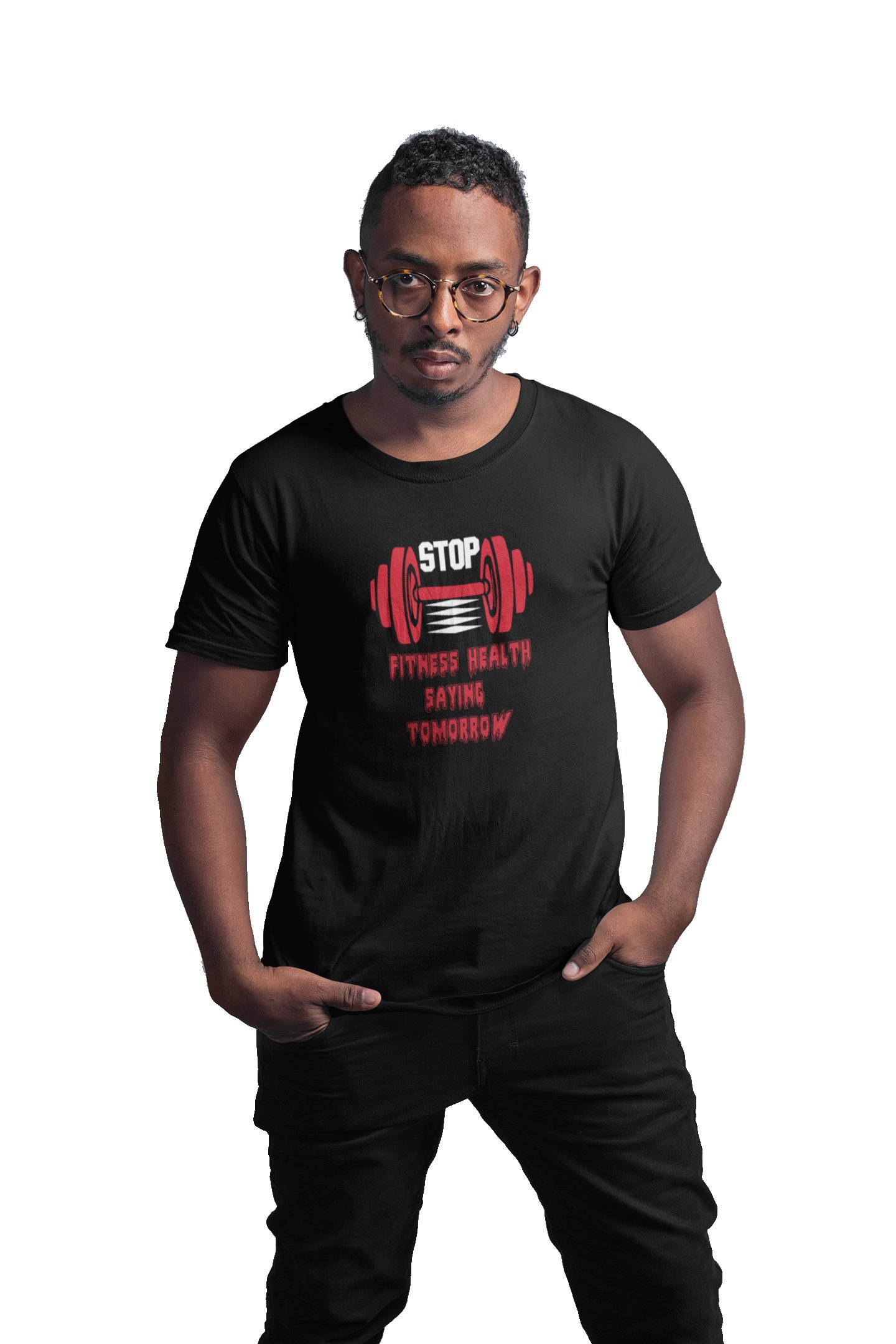 Stop, Fitness Health Saying Tomorrow, Round Neck Gym Tshirt (Black Tshirt) - Clothes for Gym Lovers - Suitable for Gym Going Person - Foremost Gifting Material for Your Friends and Close Ones