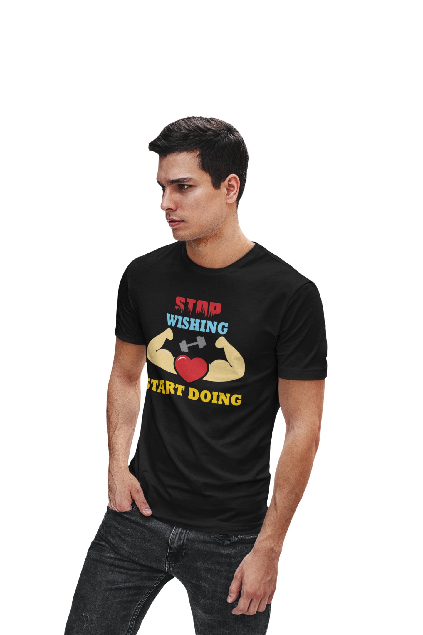 Stop Wishing, Start Doing, (BG Red, Blue and Yellow), Round Neck Gym Tshirt (White Tshirt) - Clothes for Gym Lovers - Suitable for Gym Going Person - Foremost Gifting Material for Your Friends and Close Ones