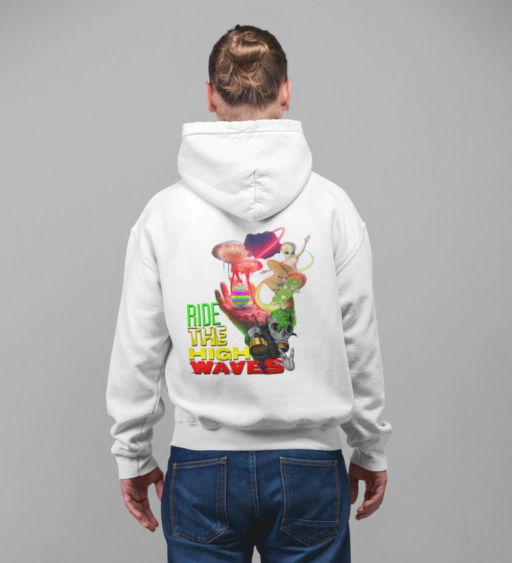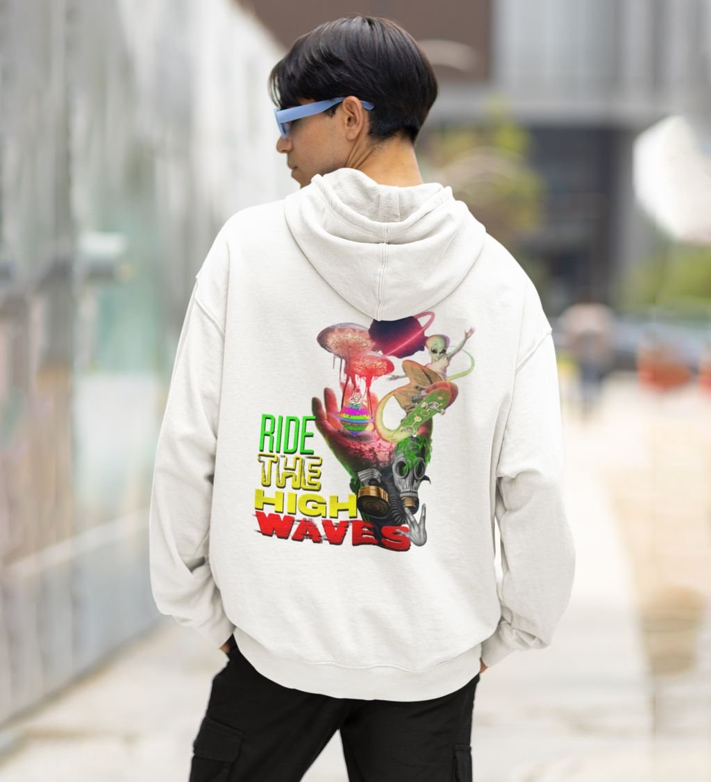 Surf the Cosmic Flow Ride The High Waves White Cotton Printed Hoodies For Men