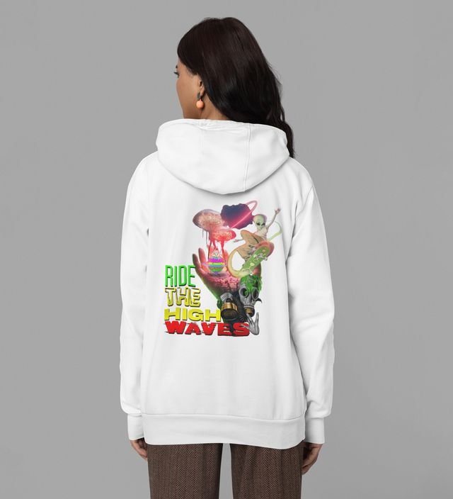 Surf the Cosmic Flow Ride The High Waves White Cotton Printed Hoodies For Women