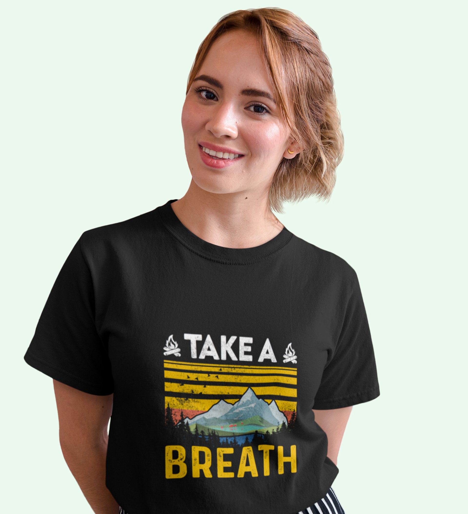 HopOfferTake a breath (Yellow Text) Black Round Neck Cotton Half Sleeved Women's T-Shirt with Printed Graphics