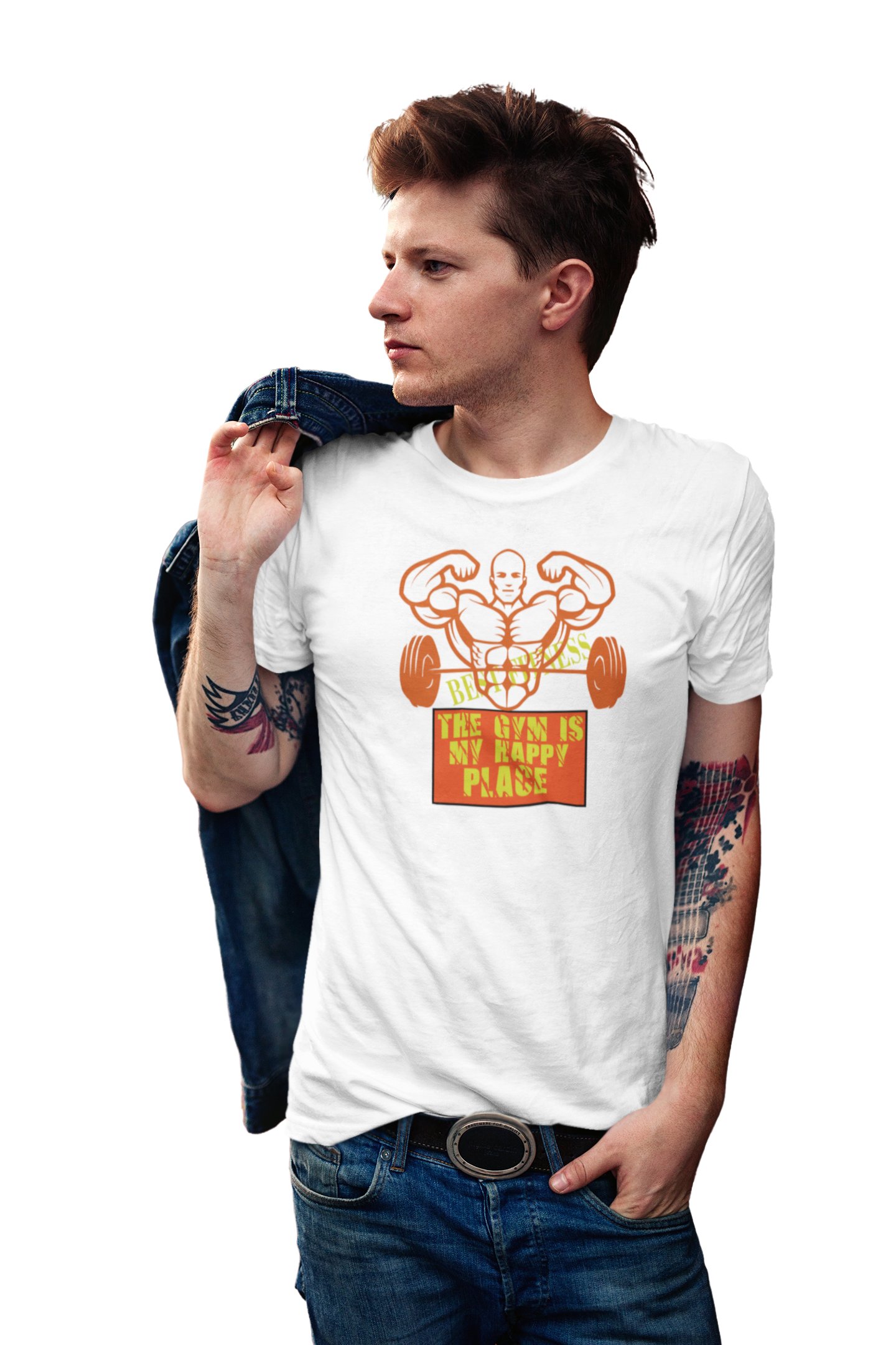 The Gym Is My Happy Place, (BG Orange), Round Neck Gym Tshirt (White Tshirt) - Clothes for Gym Lovers - Suitable for Gym Going Person - Foremost Gifting Material for Your Friends and Close Ones