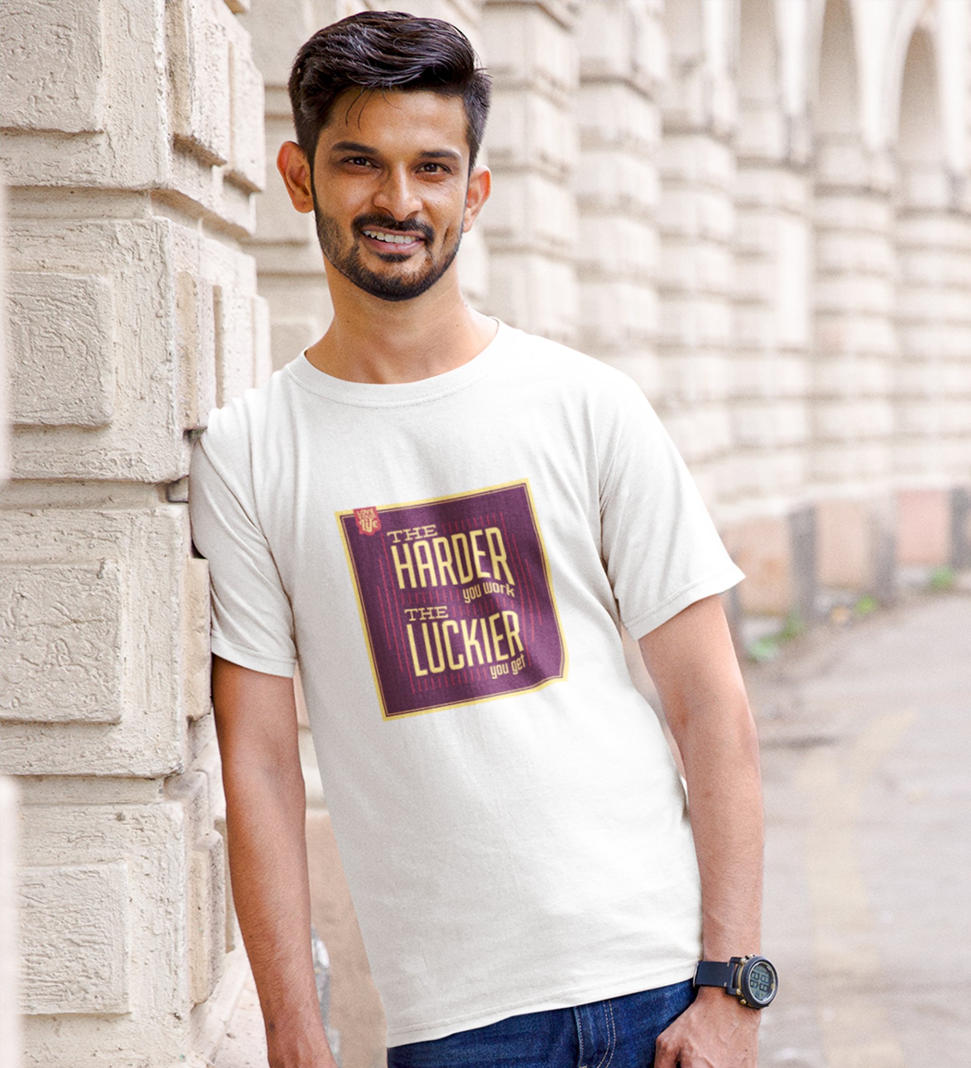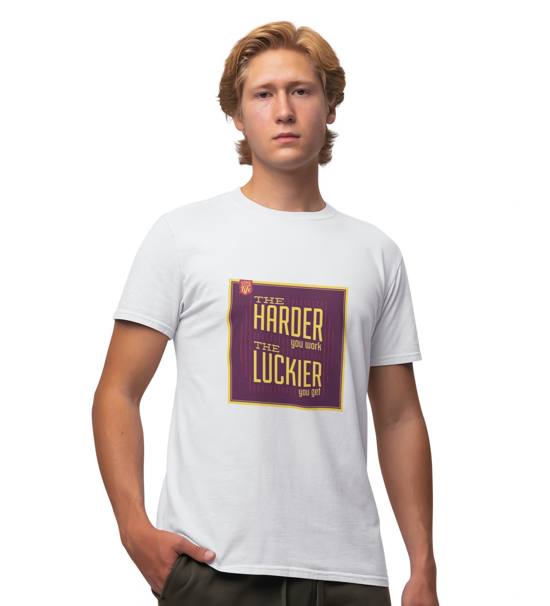 Hardwork Brings Luck White Round Neck Cotton Half Sleeved Men's T-Shirt with Printed Graphics