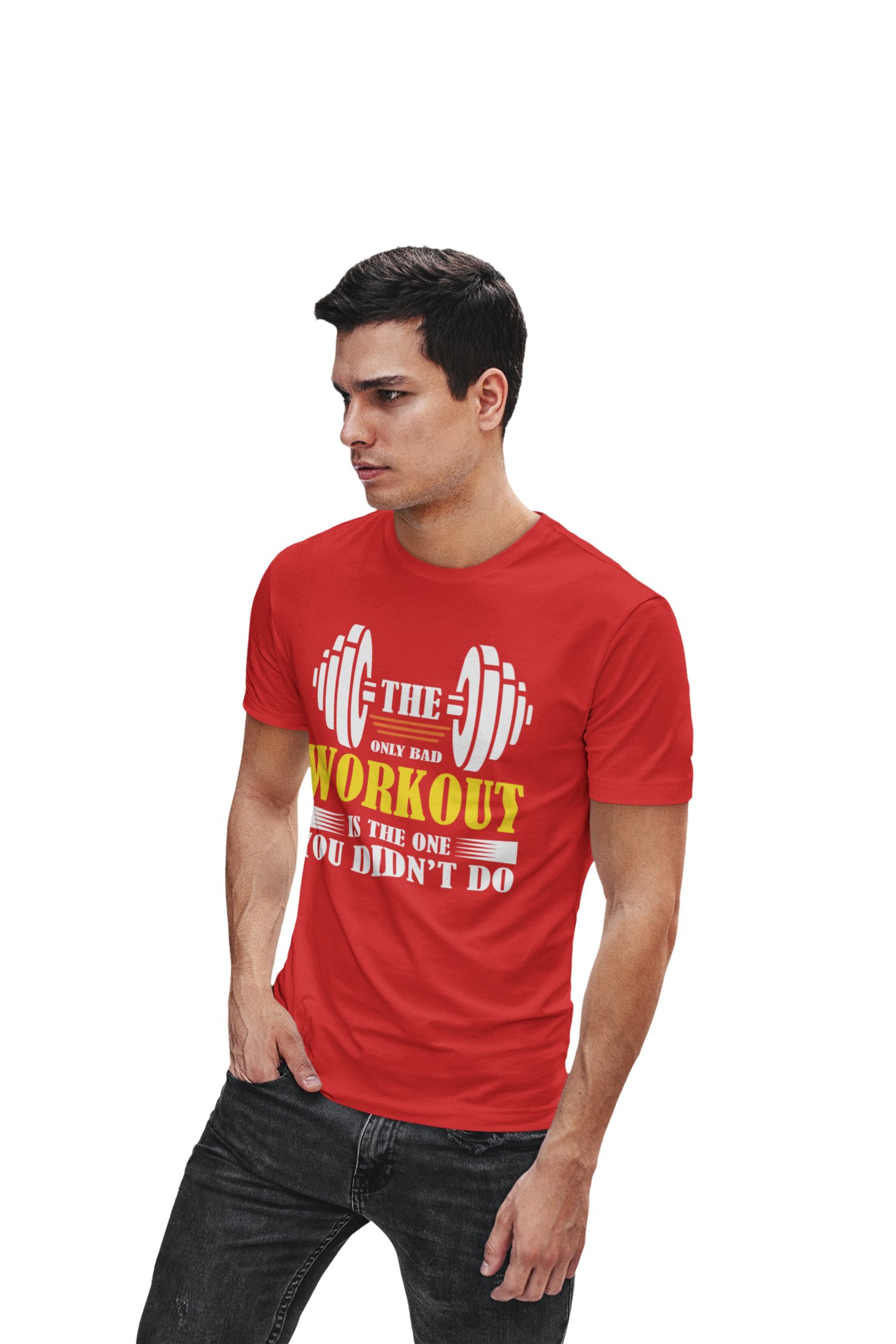 The Only Bad Workout is The One, You Didn't Do, (BG Yellow, Blue and Orange), Round Neck Gym Tshirt (Red Tshirt) - Clothes for Gym Lovers - Foremost Gifting Material for Your Friends and Close Ones