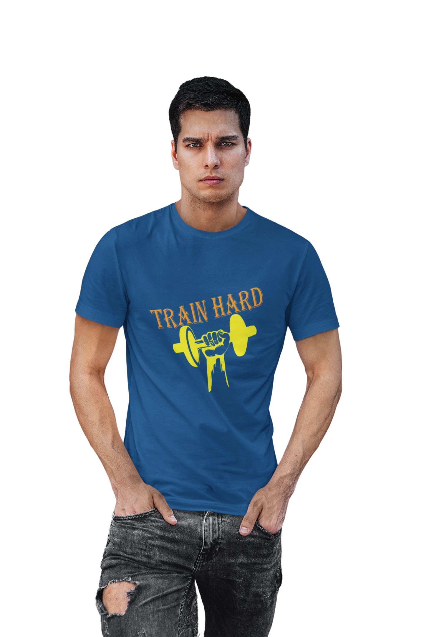 Train Hard, (BG Orange and Yellow), Round Neck Gym Tshirt (Blue Tshirt) - Clothes for Gym Lovers - Suitable for Gym Going Person - Foremost Gifting Material for Your Friends and Close Ones