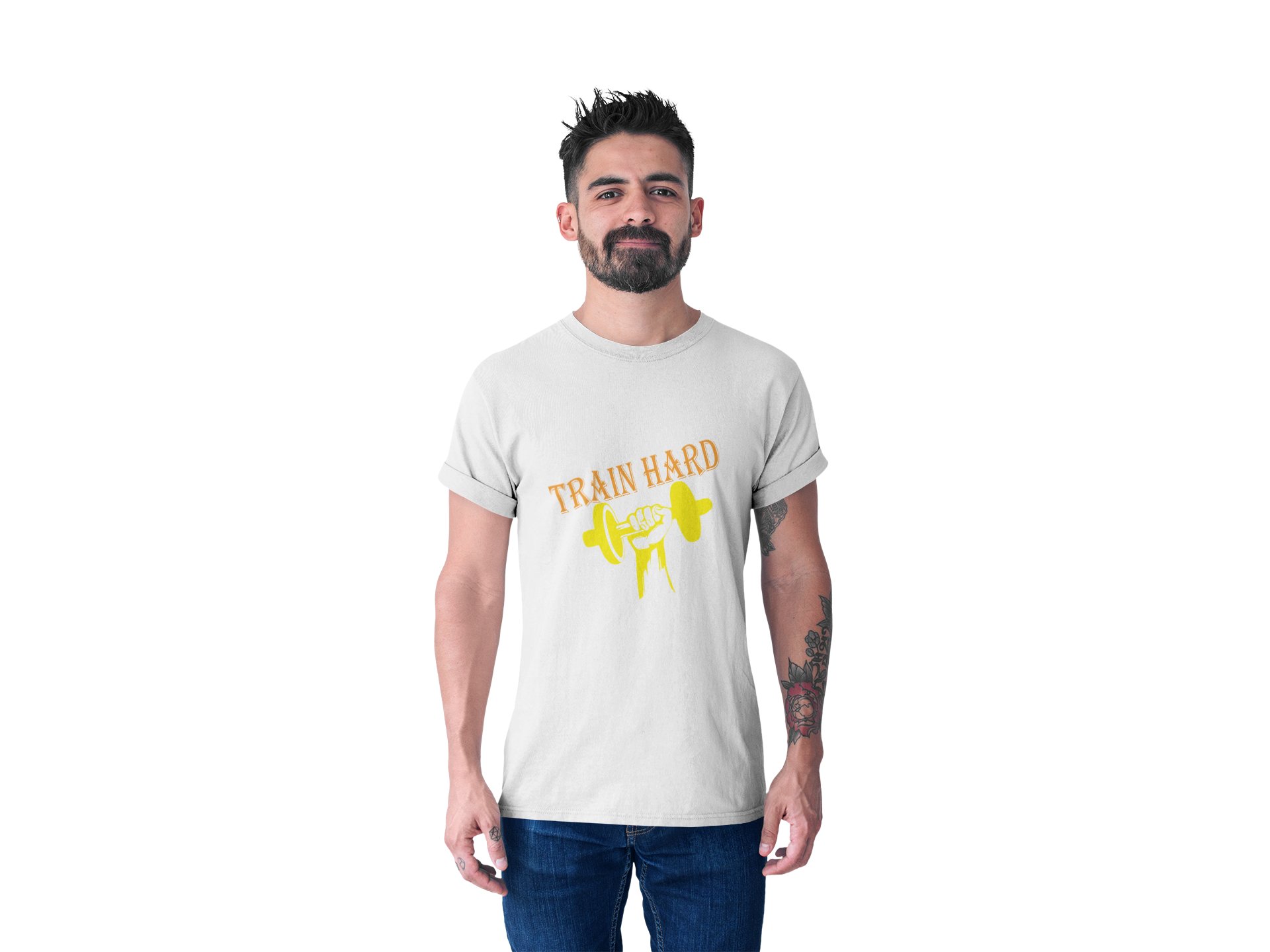 Train Hard,(BG Yellow and Orange), Round Neck Gym Tshirt (White Tshirt) - Clothes for Gym Lovers - Foremost Gifting Material for Your Friends and Close Ones