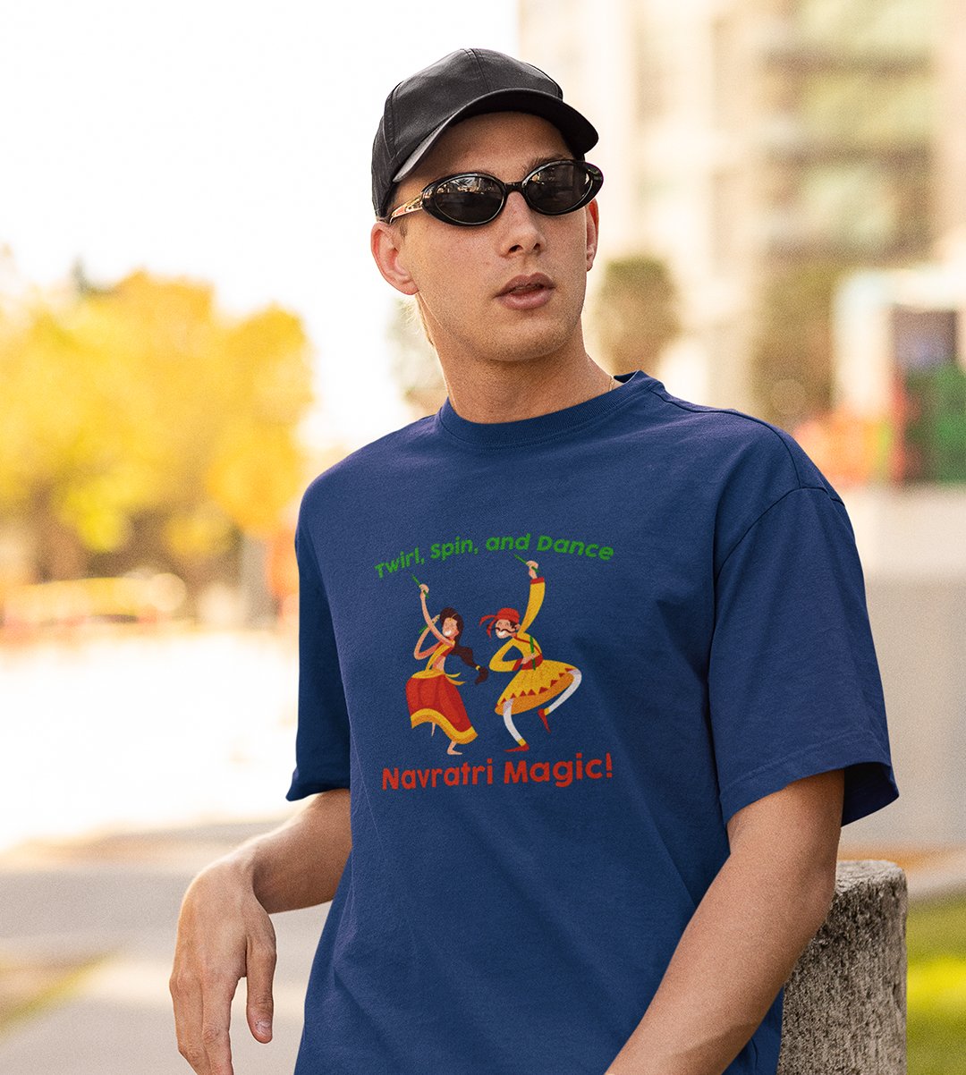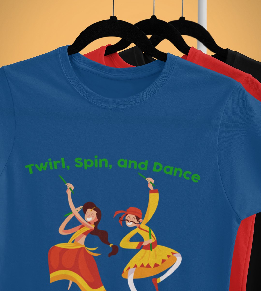 Twirl, spin and dance printed unisex adults round neck cotton half-sleeve blue tshirt specially for Navratri festival/ Durga puja