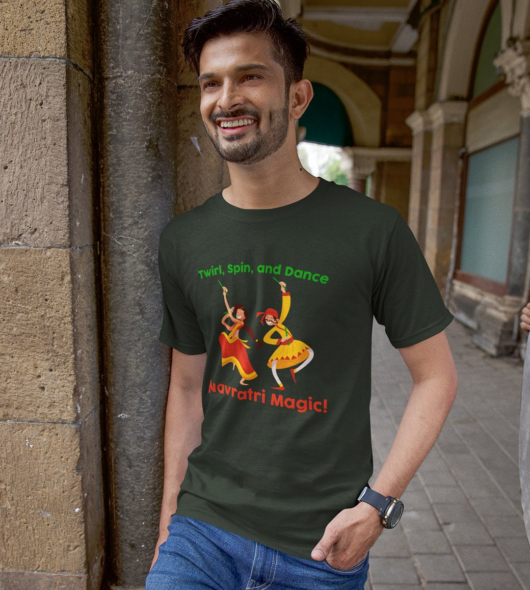 Twirl, spin and dance printed unisex adults round neck cotton half-sleeve green tshirt specially for Navratri festival/ Durga puja
