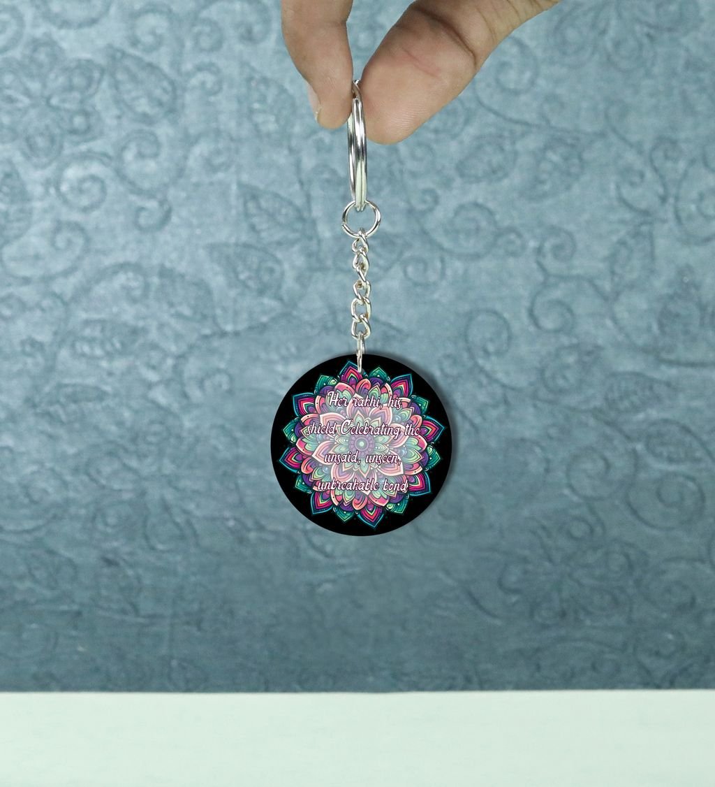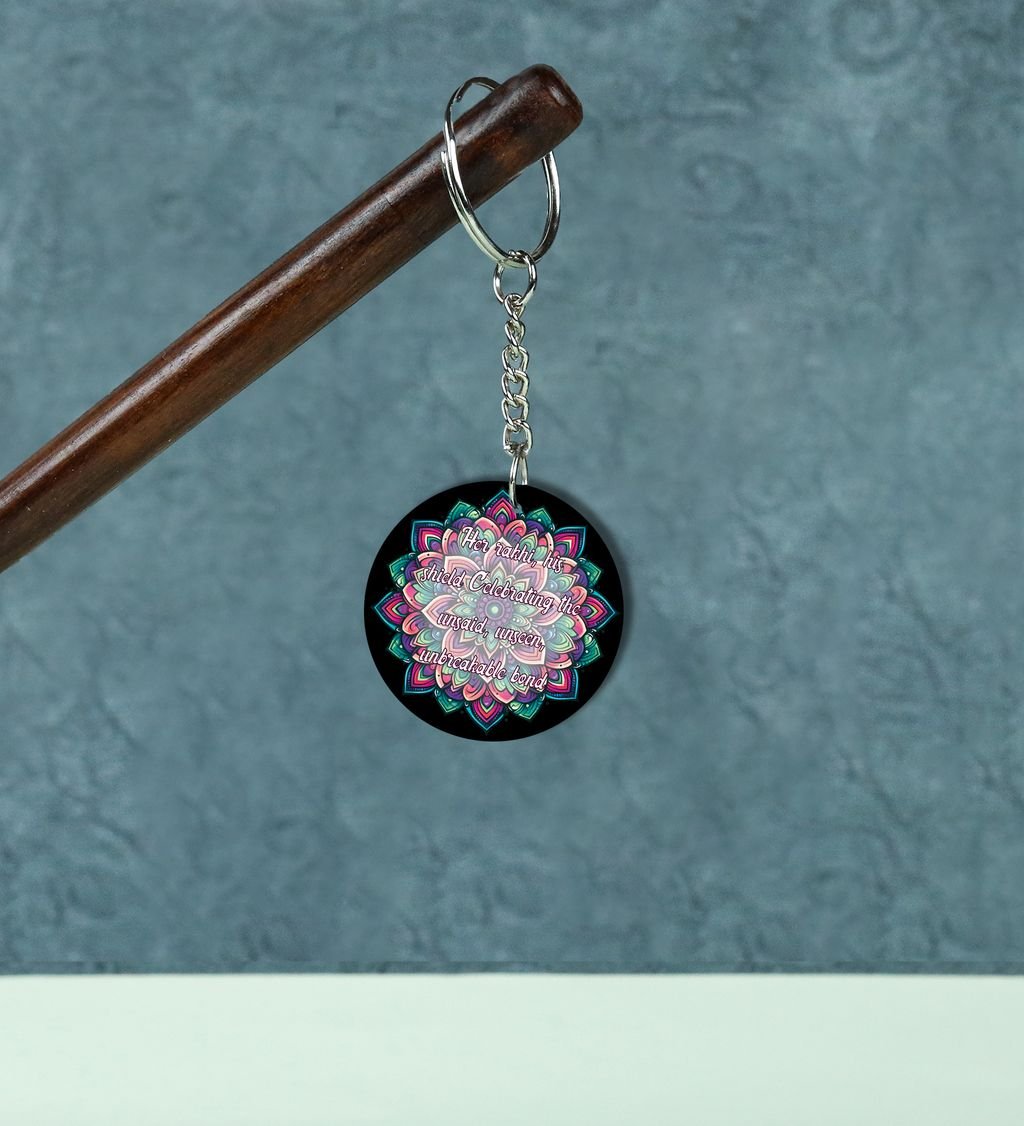 Celebrate the sacred bond of protection and tradition with our Rak?ha?sk?it Round Keychain. Inspired by ancient Indian motifs and symbols of divine guardianship, this keychain blends cultural elegance with daily utility. A perfect token to carry blessings wherever you go, it's more than just a keyholder