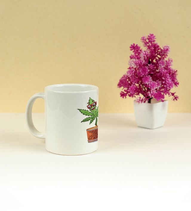 Start your day with a burst of vibrant energy! This printed coffee mug features a psychedelic leaf artwork surrounded by colorful flame-like patterns