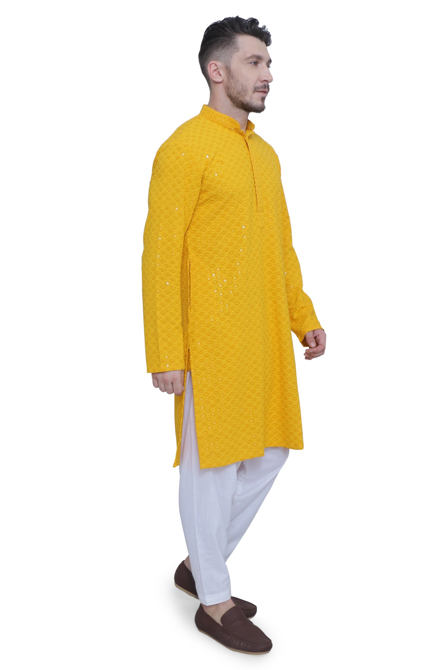 Make a bold statement with our Vibrant Yellow Chikankari Men's Kurta Set. Crafted from high-quality Chikankari fabric, this ensemble ensures unmatched comfort. The eye-catching Yellow color exudes vibrancy and style, and the intricate chikankari embroidery adds a touch of traditional artistry