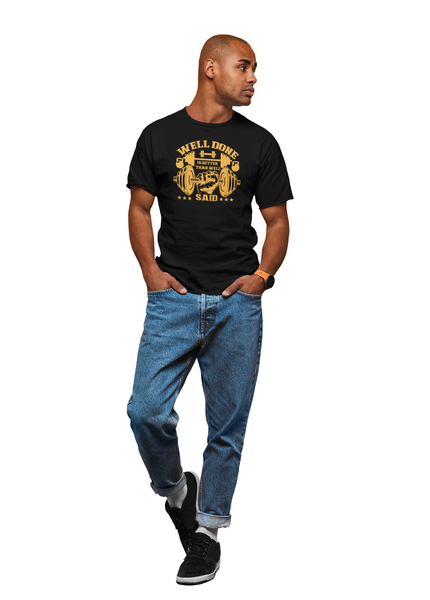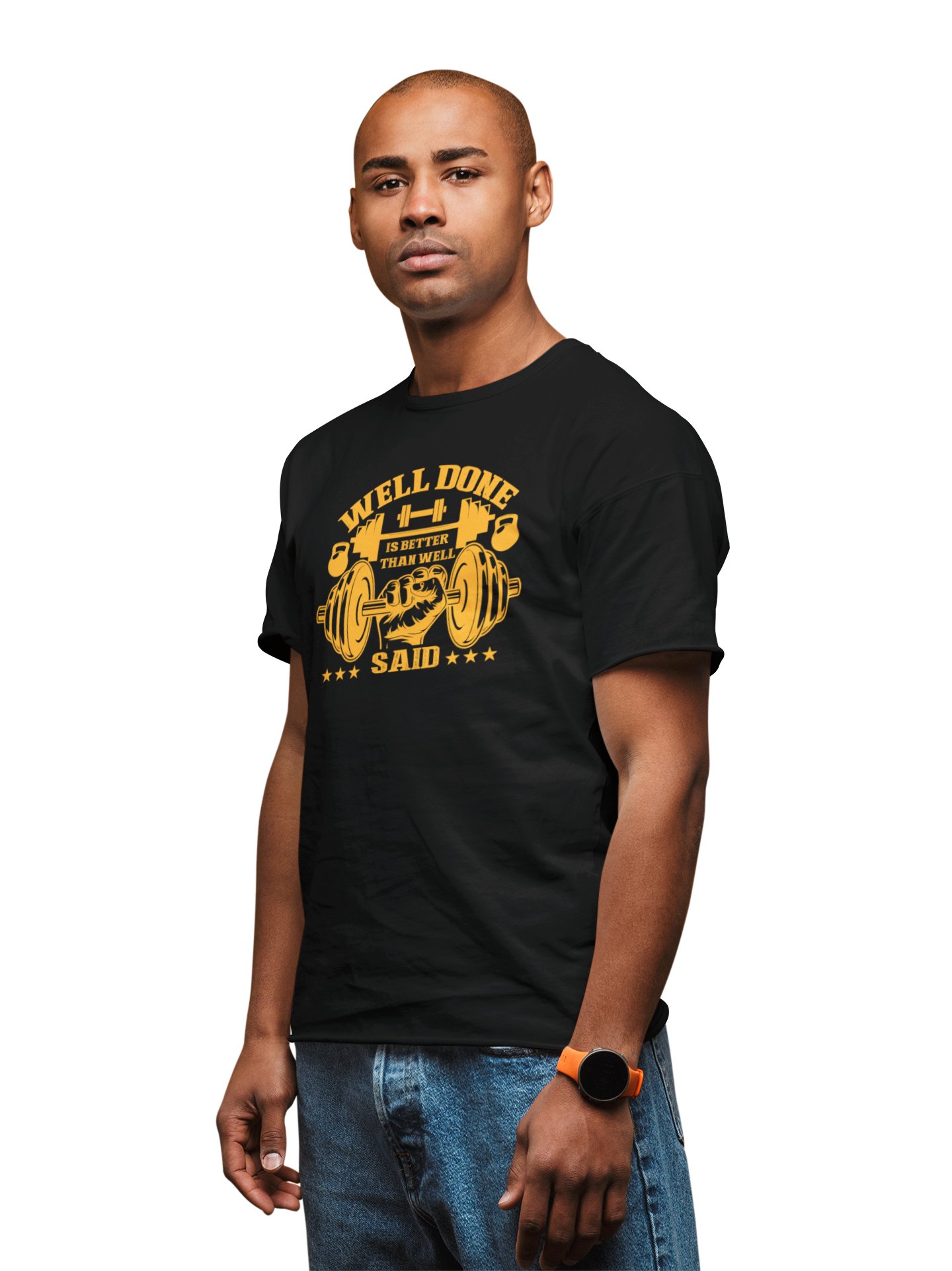 Well Done Is Better Than Well Said, Round Neck Gym Tshirt (White Tshirt) - Clothes for Gym Lovers - Suitable for Gym Going Person - Foremost Gifting Material for Your Friends and Close Ones