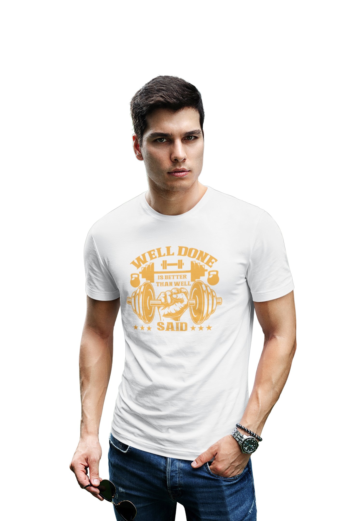 Welldone Is Better Than Well Said, (BG Golden) Round Neck Gym Tshirt (White Tshirt) - Clothes for Gym Lovers - Foremost Gifting Material for Your Friends and Close Ones