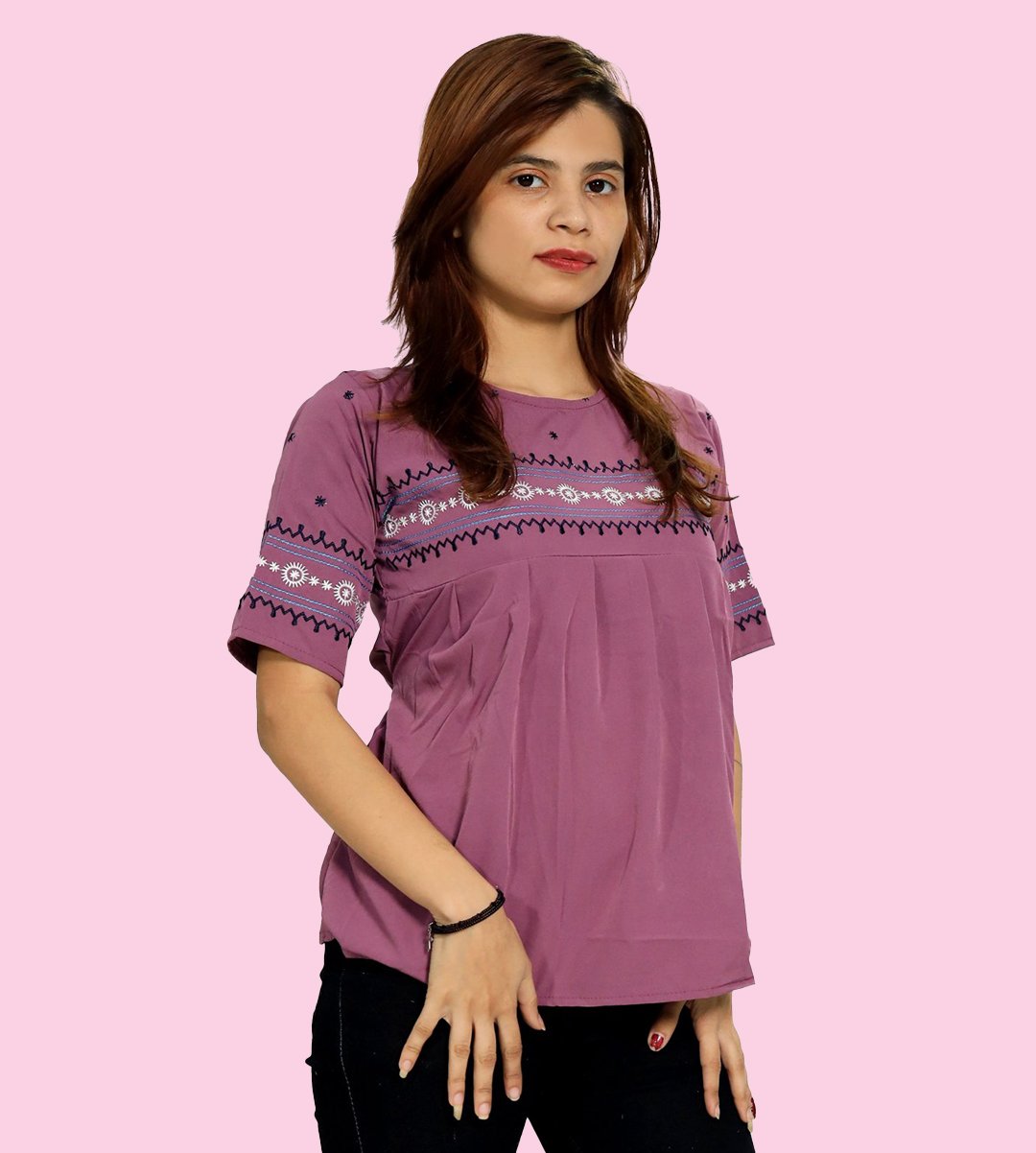 Women loves to wear top of any age groups. The fashion is not only limited upto young girls / teenagers but some married women also love to wear it. The recognization of top is very much popular in 21st century. It is used by the modernized ladies. Easy to wear. It looks good with jeans or jeggings. We have brought you a full collection of floral designs printed top to choose from. This is made up of Rayon and designed for your plesant and cozy.