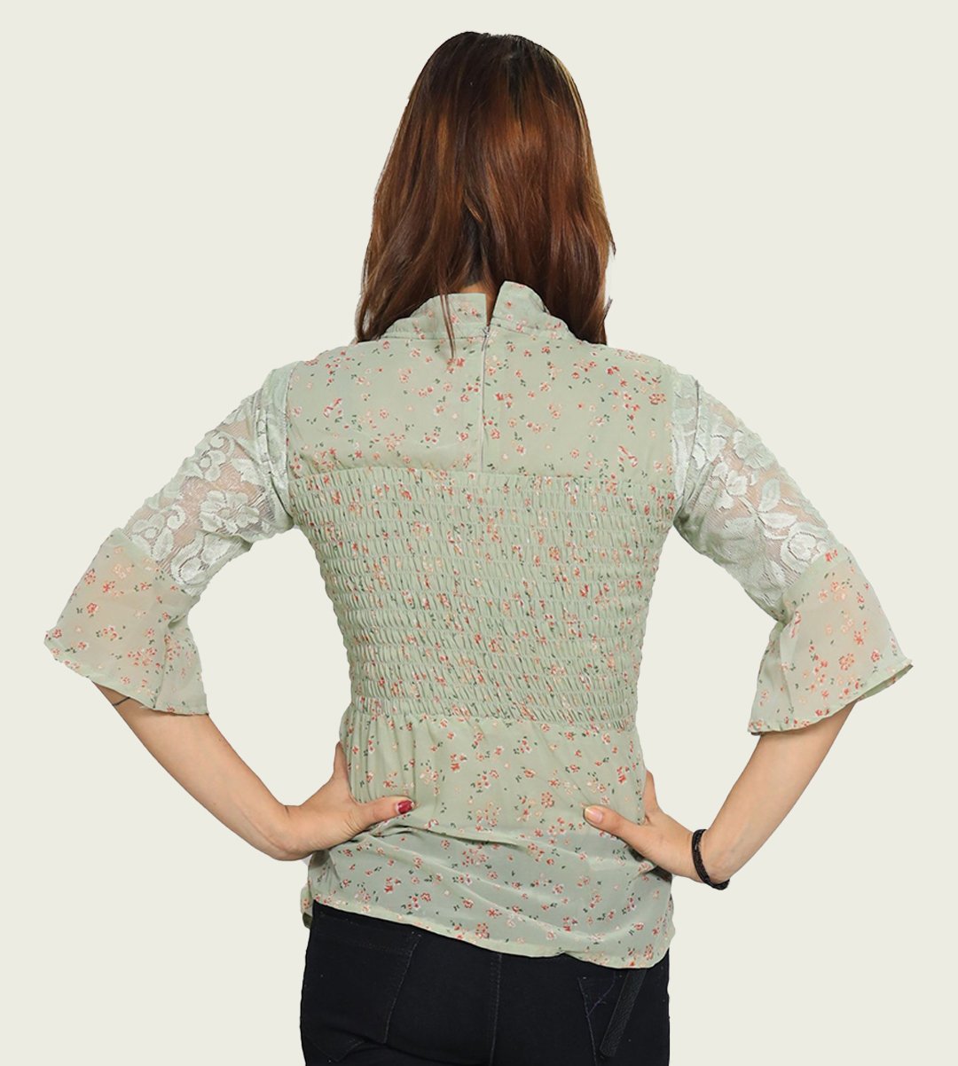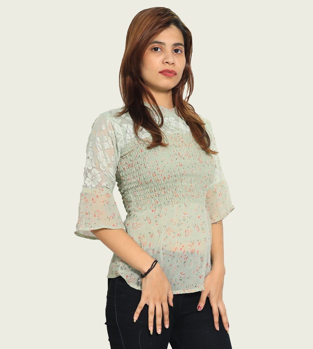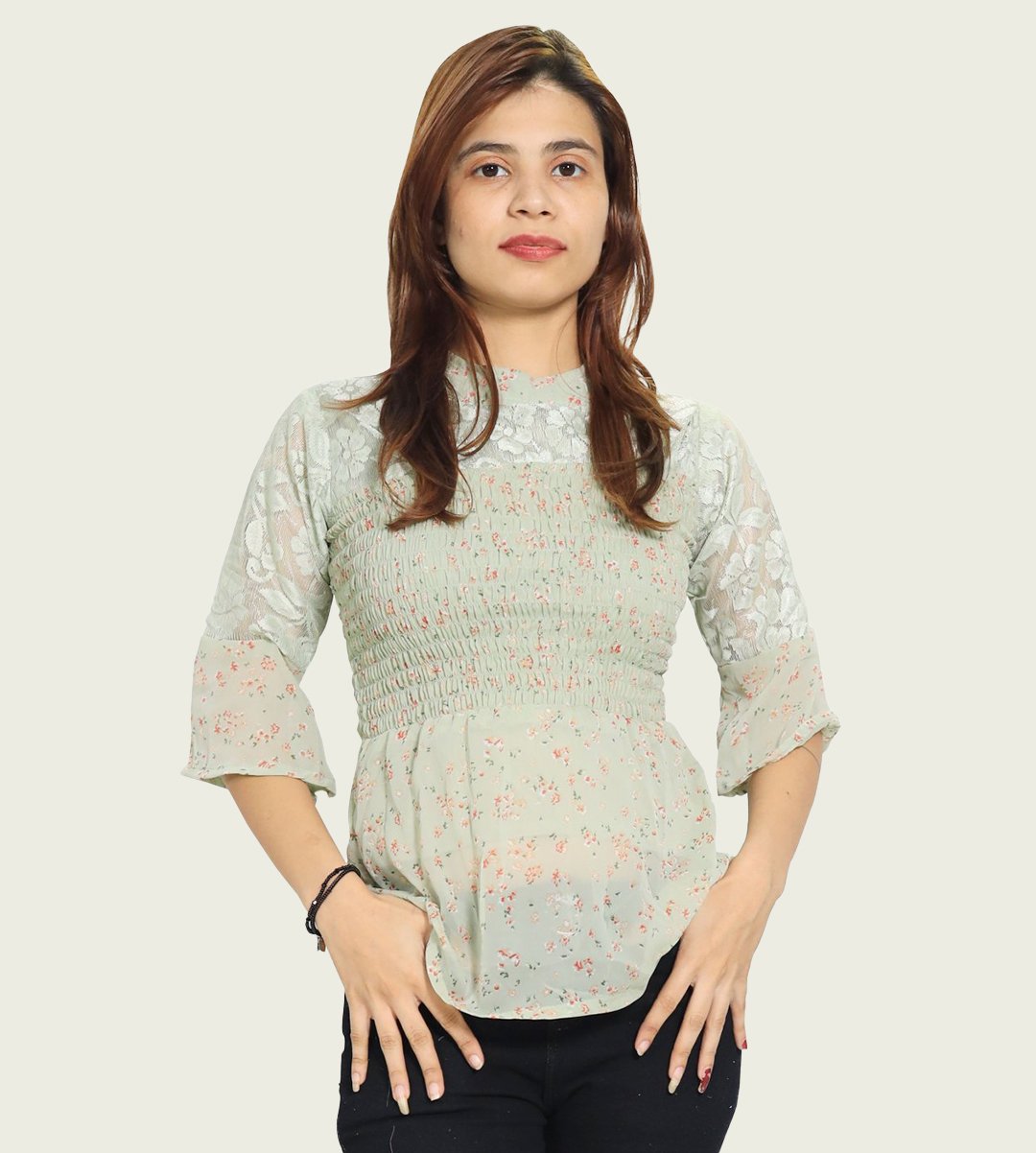 Three quarter net hand floral womens printed top (light green top) - Made up of Rayon for your plesant and cozy