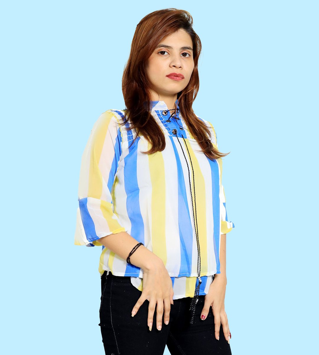 Blue, Yellow, White broad vertical lines womens printed top (yellow top) - Made up of Rayon for your plesant and cozy